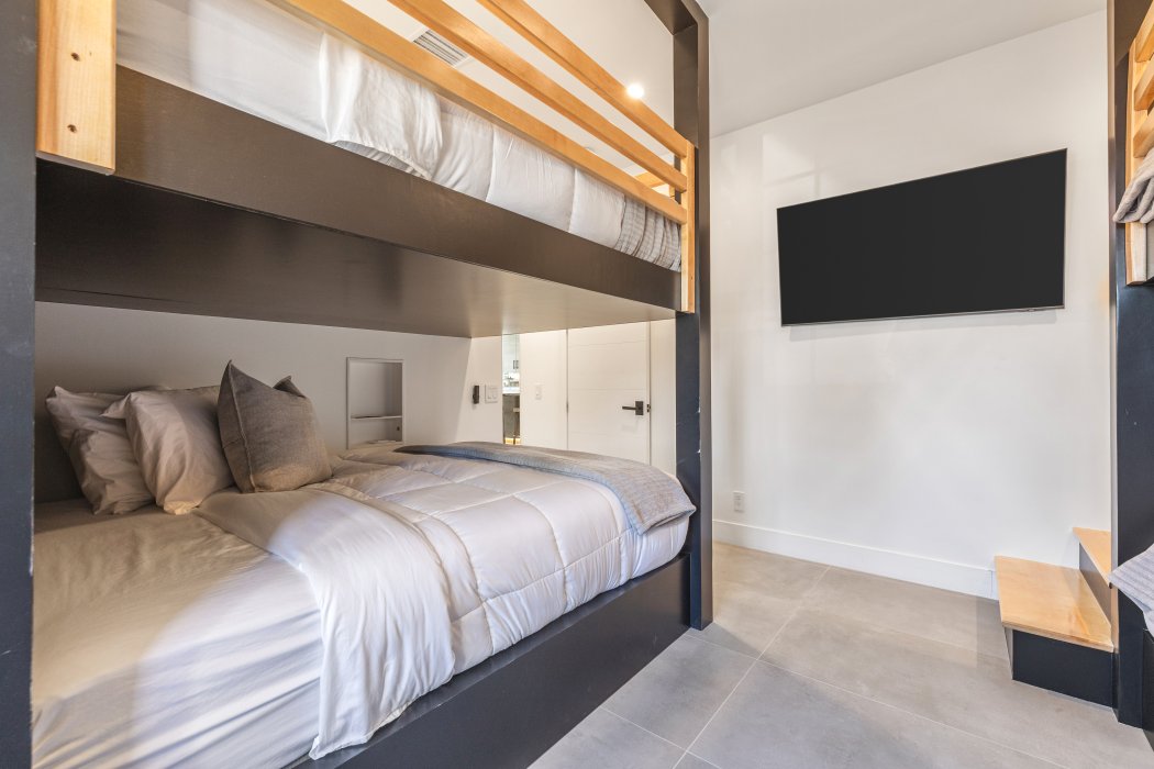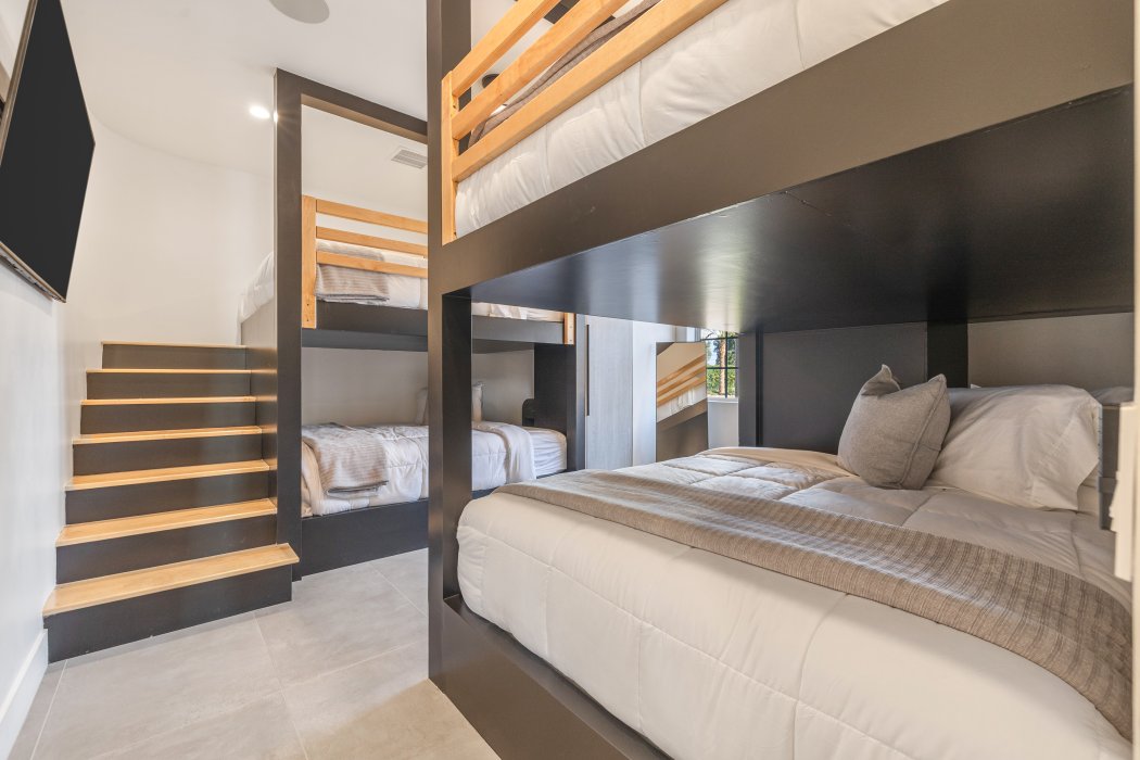The Primary Suite has a King bed, private doors to the yard and flatscreen TV. The ensuite bathroom has dual sinks, a beautiful soaking tub and shower. Attached salon with 2 chairs, mirrors and sink. Bedroom 2 has a Queen bed and ensuite bath with shower. This bathroom has outdoor pool access. Bedroom 3 has a King bed, flatscreen TV and ensuite bath with shower. Bedroom 4 has 2 Queen bunk beds for a total of 4 Queens, and uses the hall full bathroom with shower, adjacent next to the room.