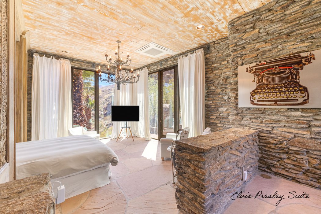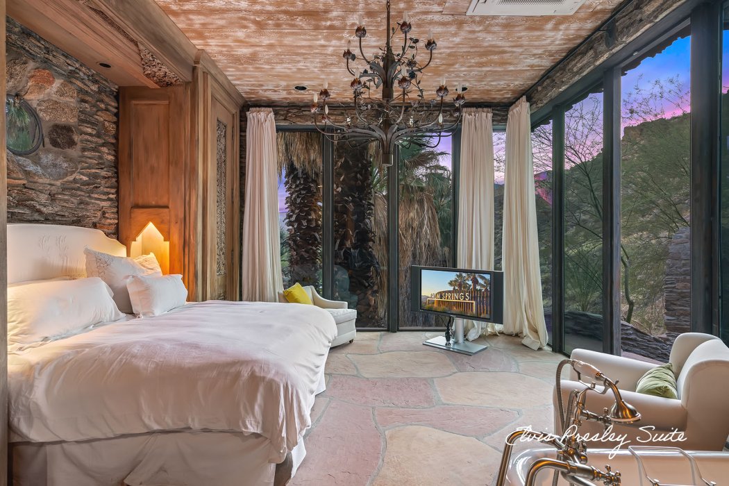 #1 Elvis Presley Suite - Designed by Albert Frey. The Elvis Presley Suite is a large Suite featuring 1 king bed, private backyard, private patio, separate bath tub and shower. Sleeps 2. Rollaway on request.