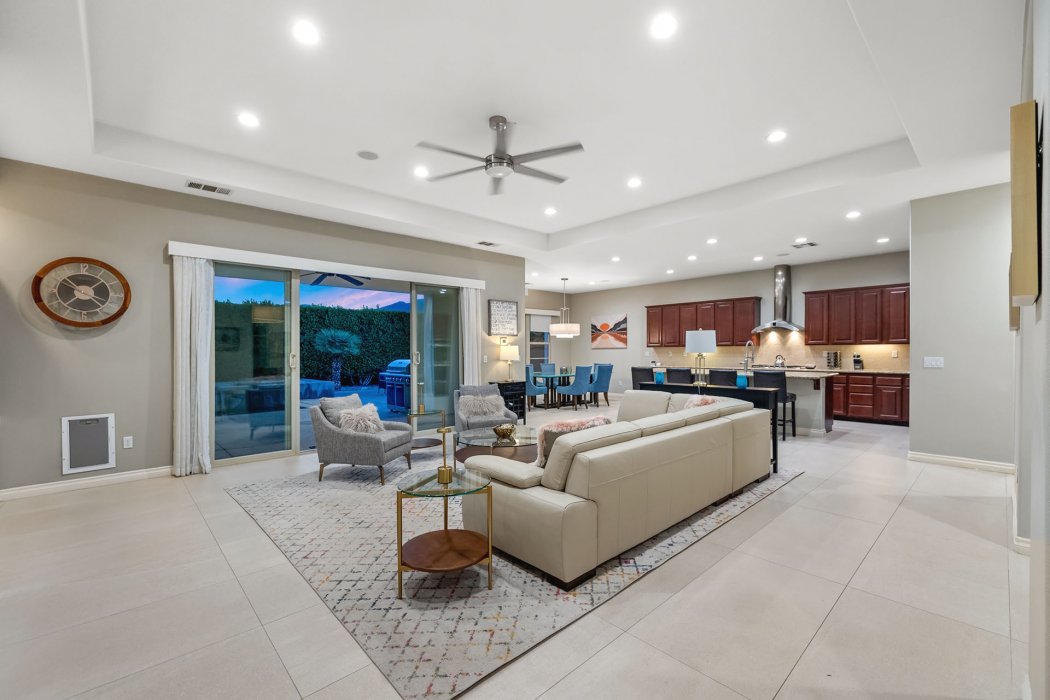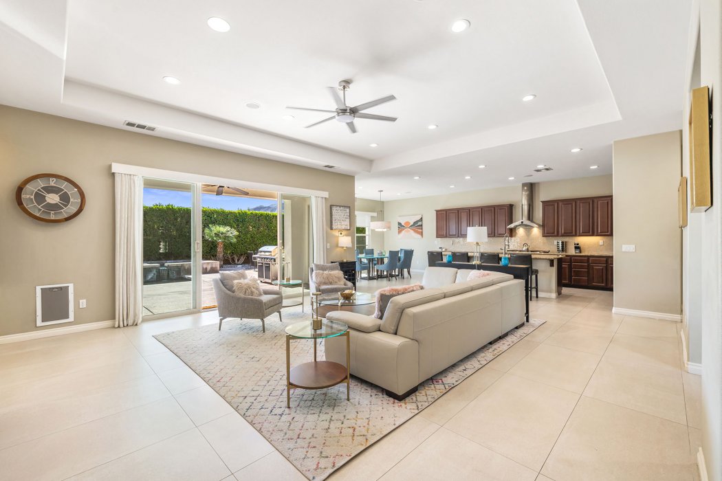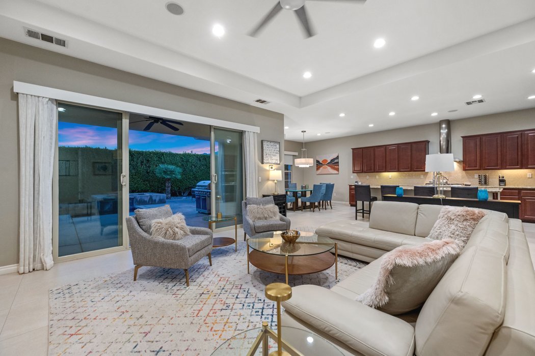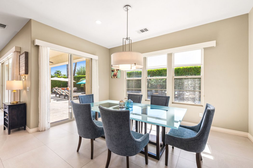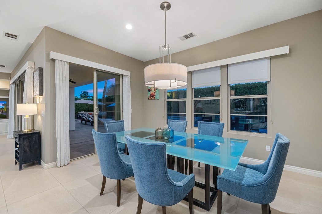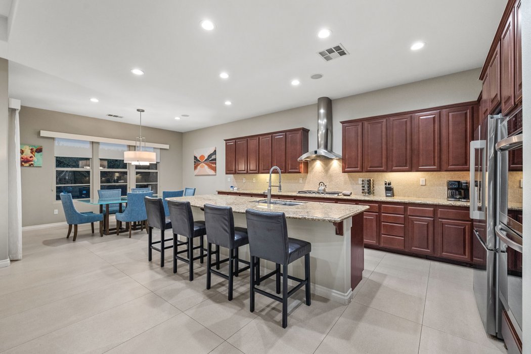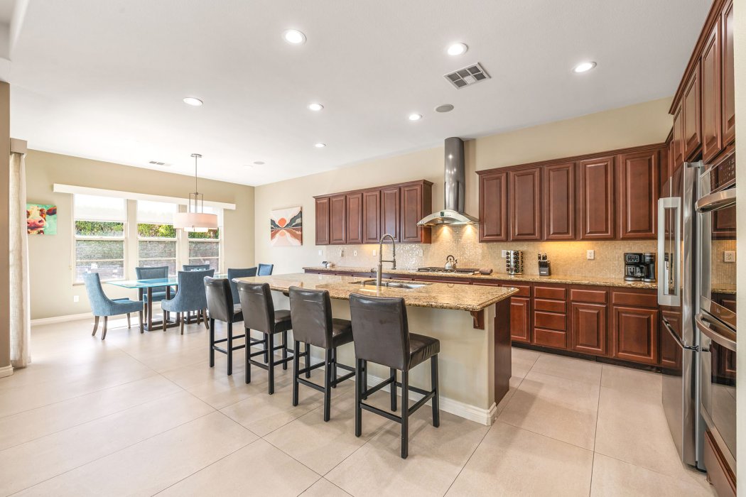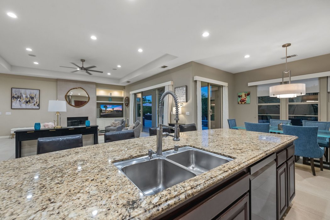 Inside, Casa Solara offers open, airy living spaces and seamless indoor-outdoor flow. The great room features high ceilings, large sliding glass doors, a cozy fireplace, and a flat-screen TV. The kitchen is fully equipped with stainless steel appliances, double ovens, and slab granite countertops, with seating for four at the kitchen island. Adjacent, the dining area seats eight, ideal for family dinners or game nights. A bonus den just off the main living area provides a quiet retreat for reading, lounging, or remote work.