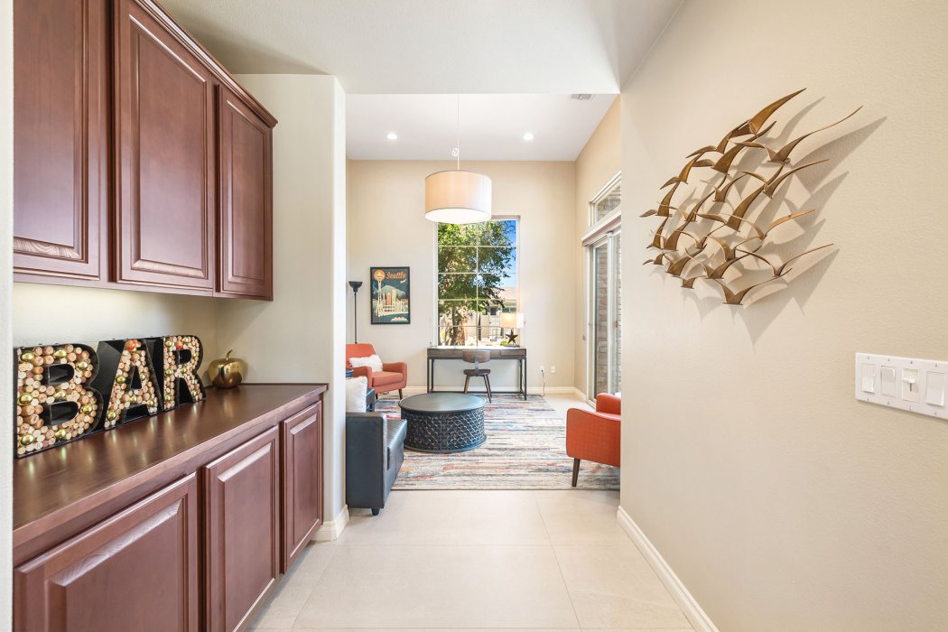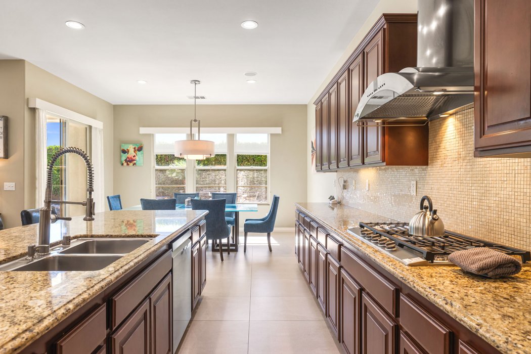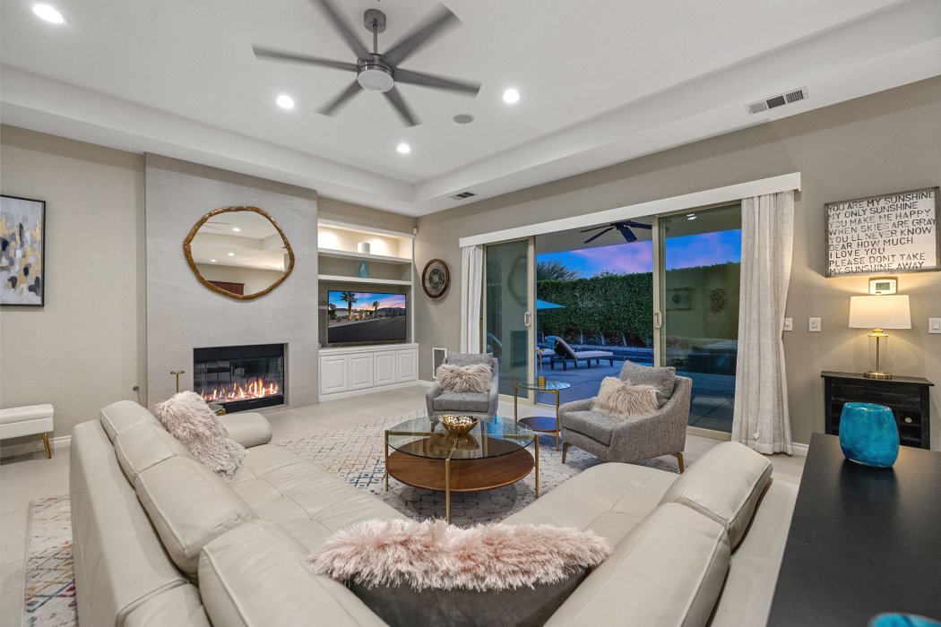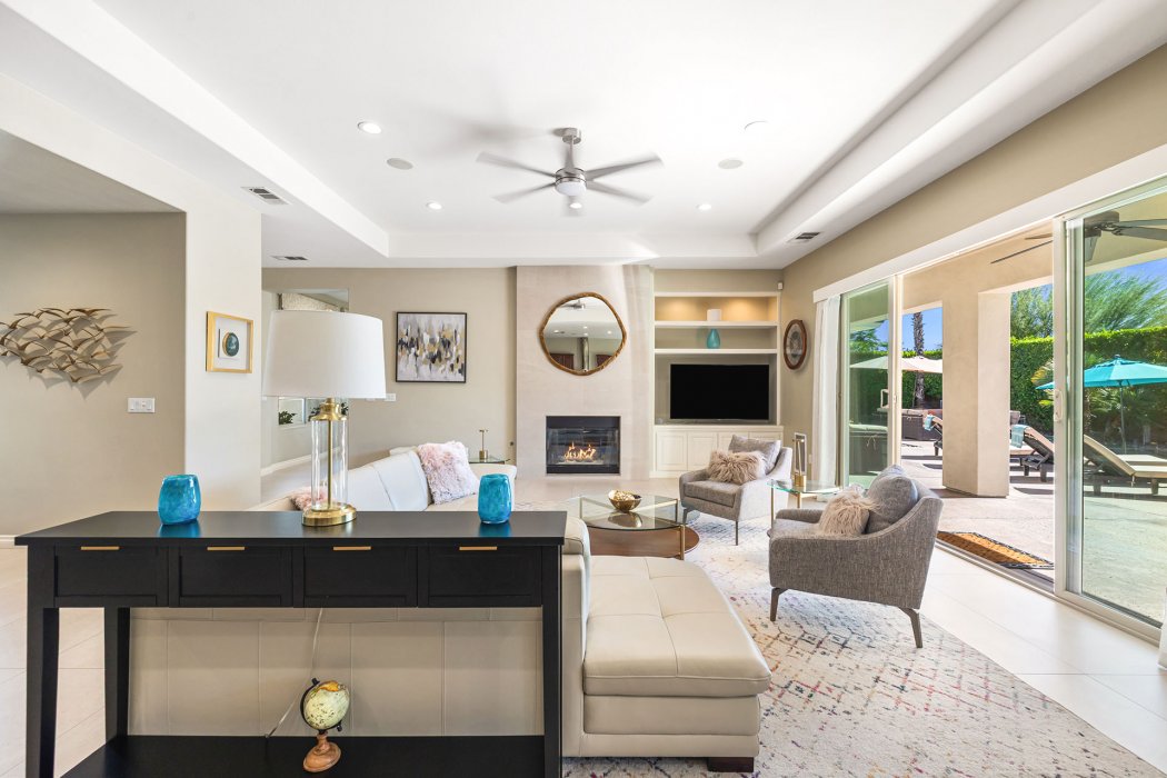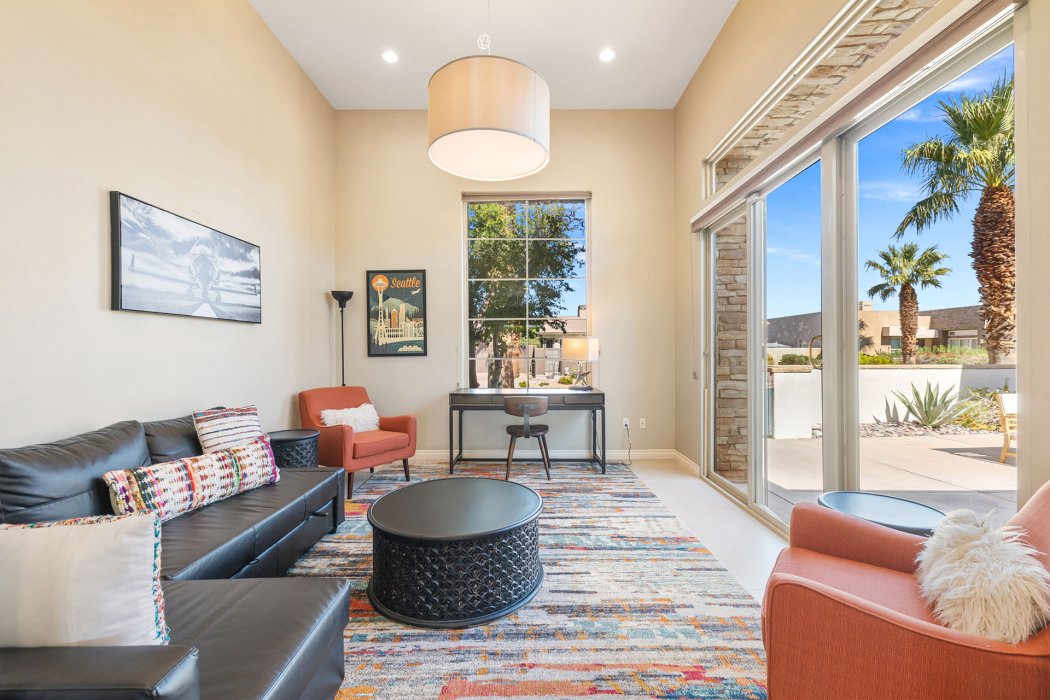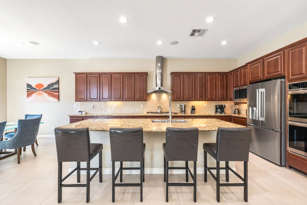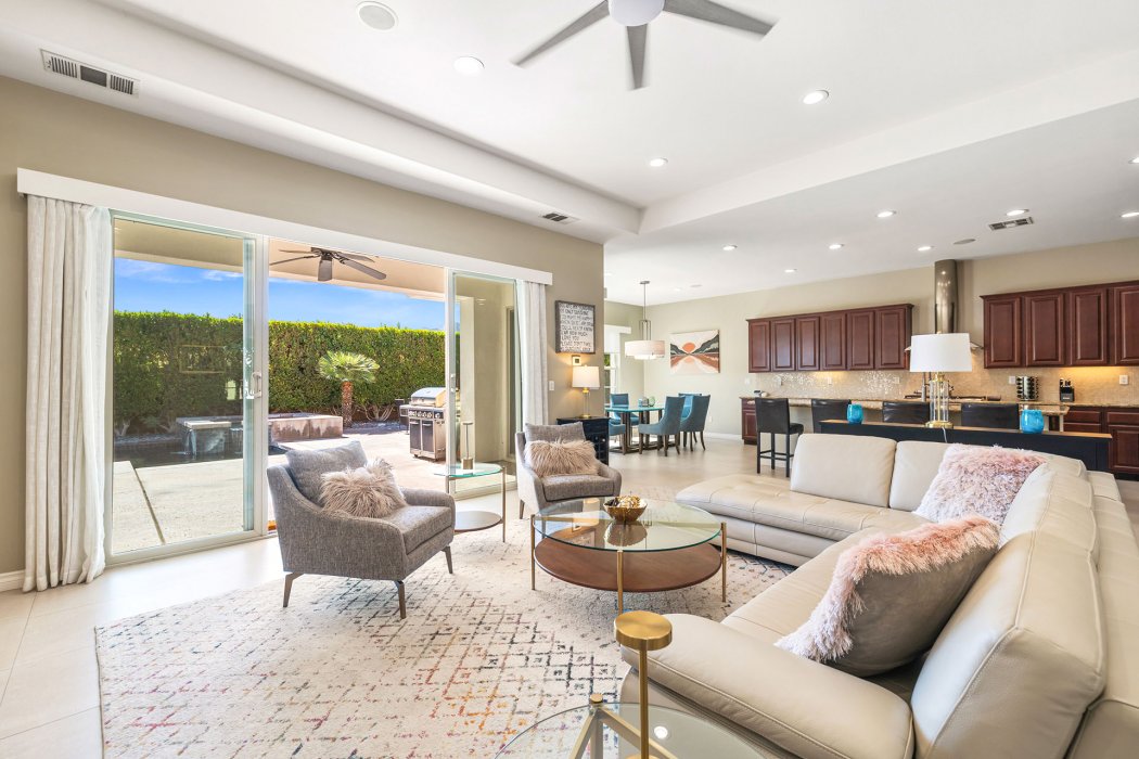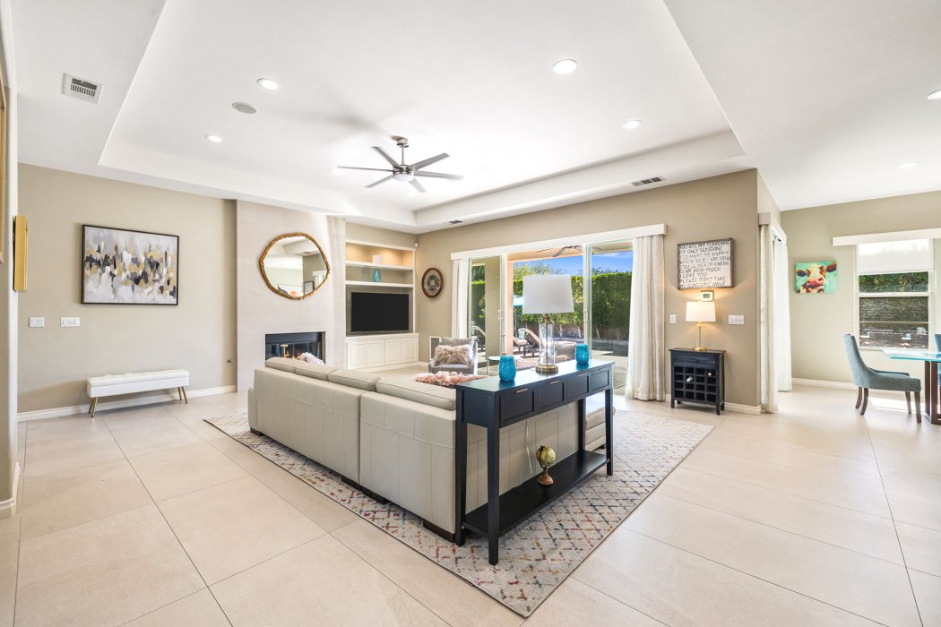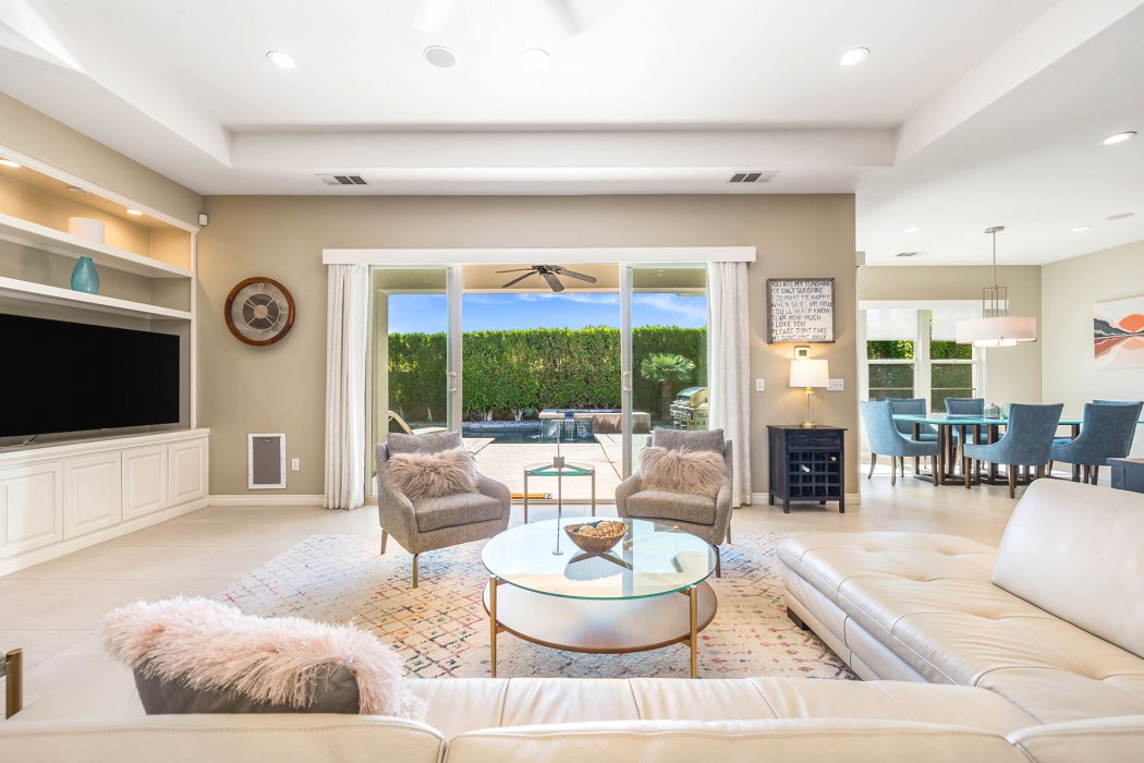 Inside, Casa Solara offers open, airy living spaces and seamless indoor-outdoor flow. The great room features high ceilings, large sliding glass doors, a cozy fireplace, and a flat-screen TV. The kitchen is fully equipped with stainless steel appliances, double ovens, and slab granite countertops, with seating for four at the kitchen island. Adjacent, the dining area seats eight, ideal for family dinners or game nights. A bonus den just off the main living area provides a quiet retreat for reading, lounging, or remote work.