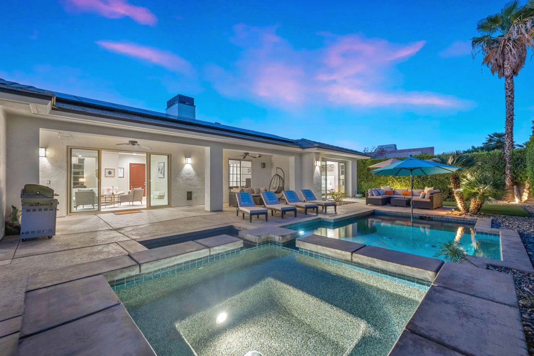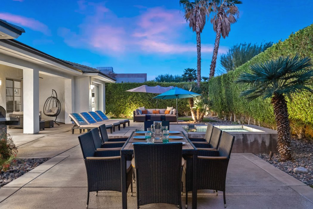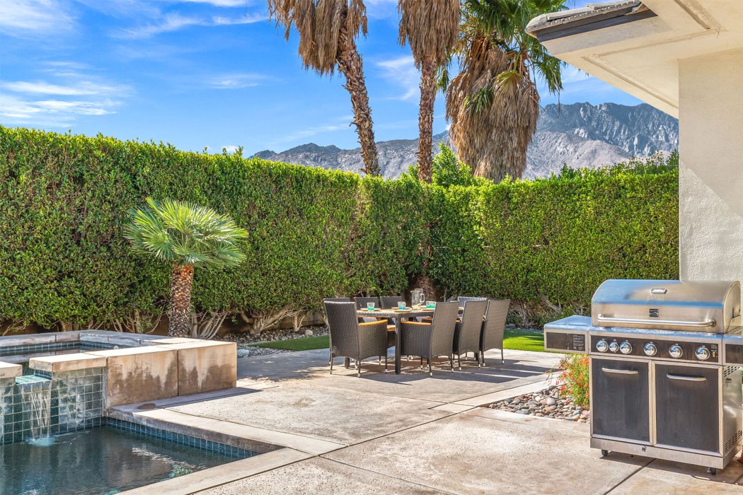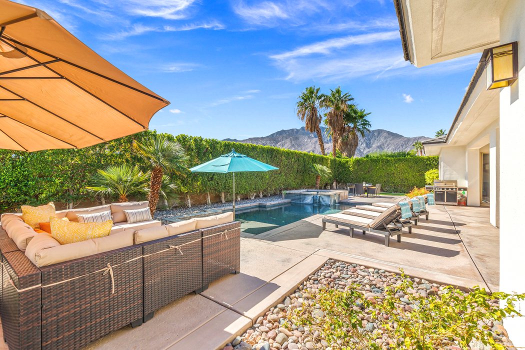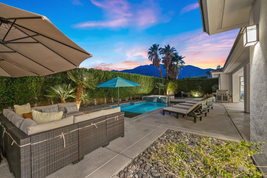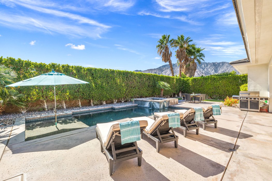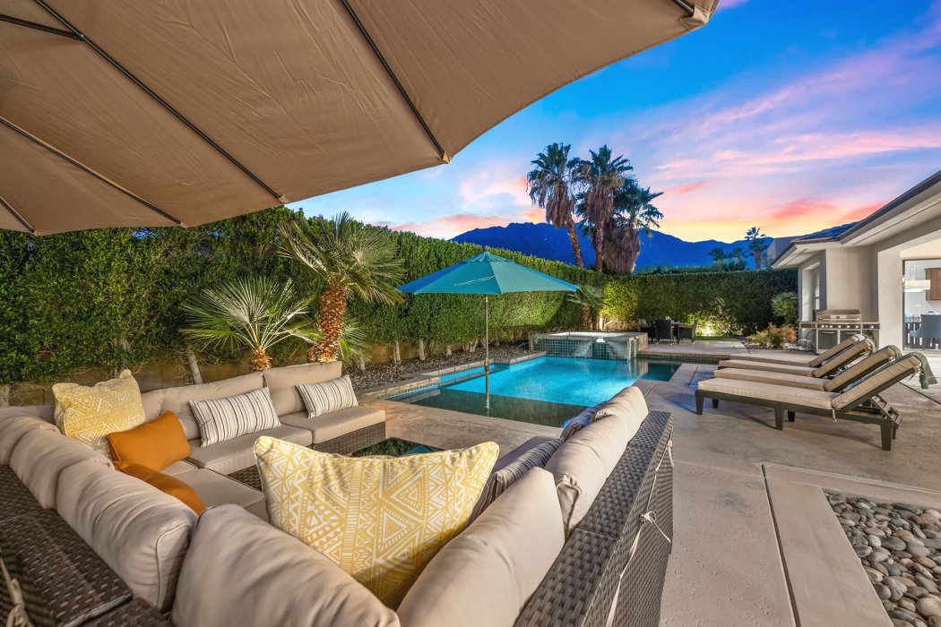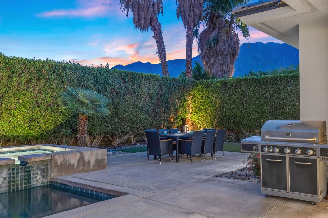 Outdoors enjoy unobstructed views of the majestic San Jacinto Mountains from the sparkling saline pool and spa. Spend sunny afternoons lounging on the comfortable chaise chairs or relaxing on the outdoor sofa. Gather around the dining table for an al fresco meal prepared on the BBQ grill. As the sun sets, retreat to the front courtyard firepit for cocktails and stargazing under the desert sky. The thoughtful layout of both the front and back outdoor areas creates the perfect blend of privacy and resort-style comfort.
