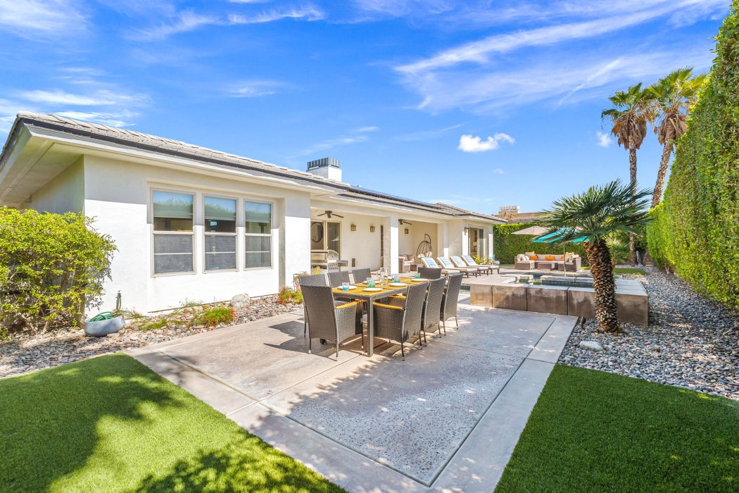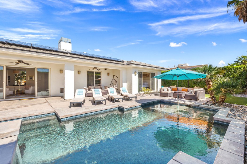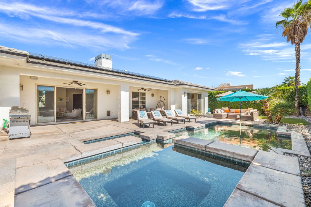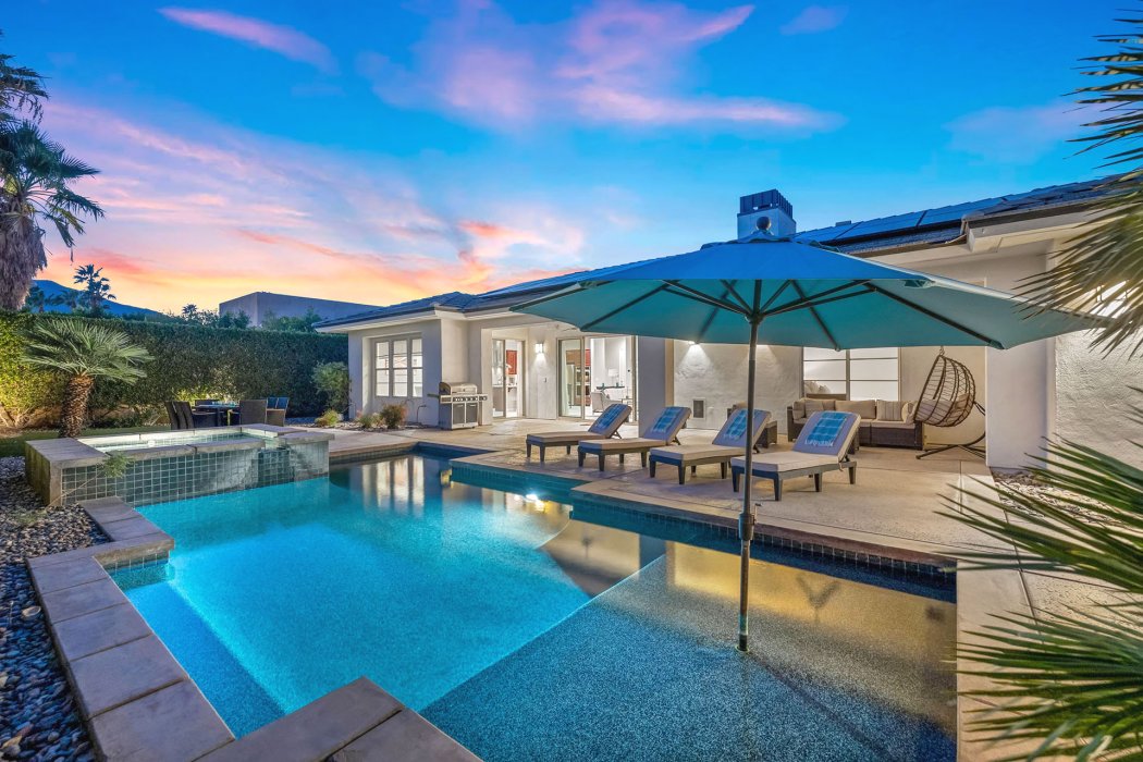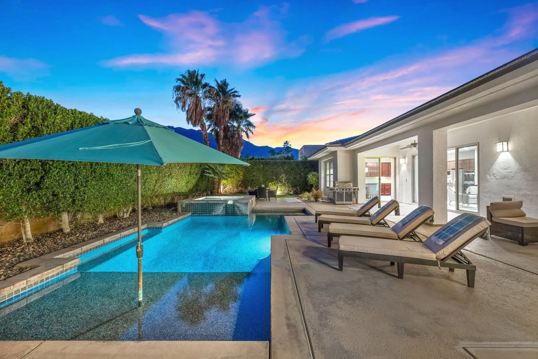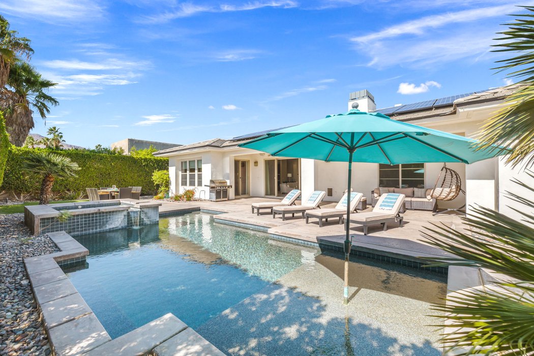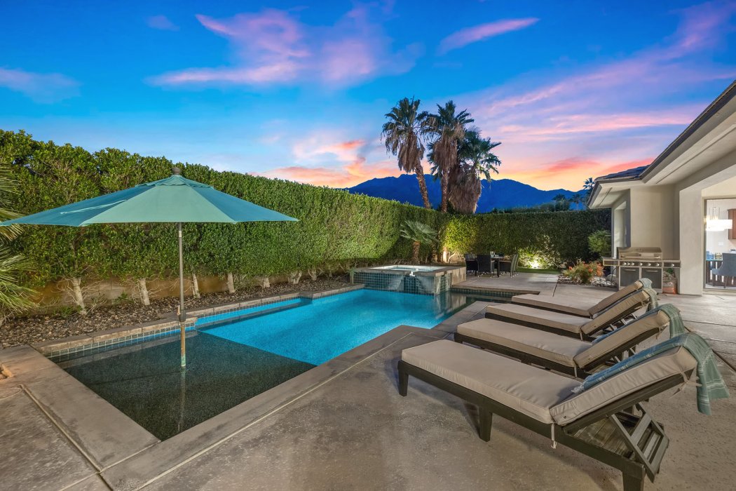 Outdoors enjoy unobstructed views of the majestic San Jacinto Mountains from the sparkling saline pool and spa. Spend sunny afternoons lounging on the comfortable chaise chairs or relaxing on the outdoor sofa. Gather around the dining table for an al fresco meal prepared on the BBQ grill. As the sun sets, retreat to the front courtyard firepit for cocktails and stargazing under the desert sky. The thoughtful layout of both the front and back outdoor areas creates the perfect blend of privacy and resort-style comfort.