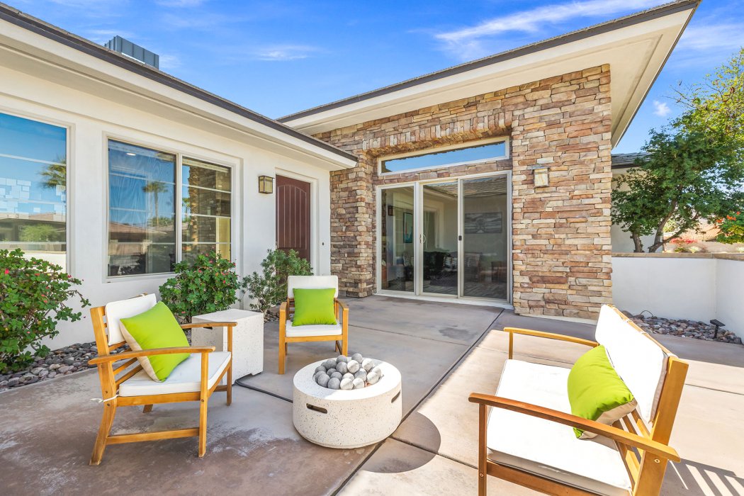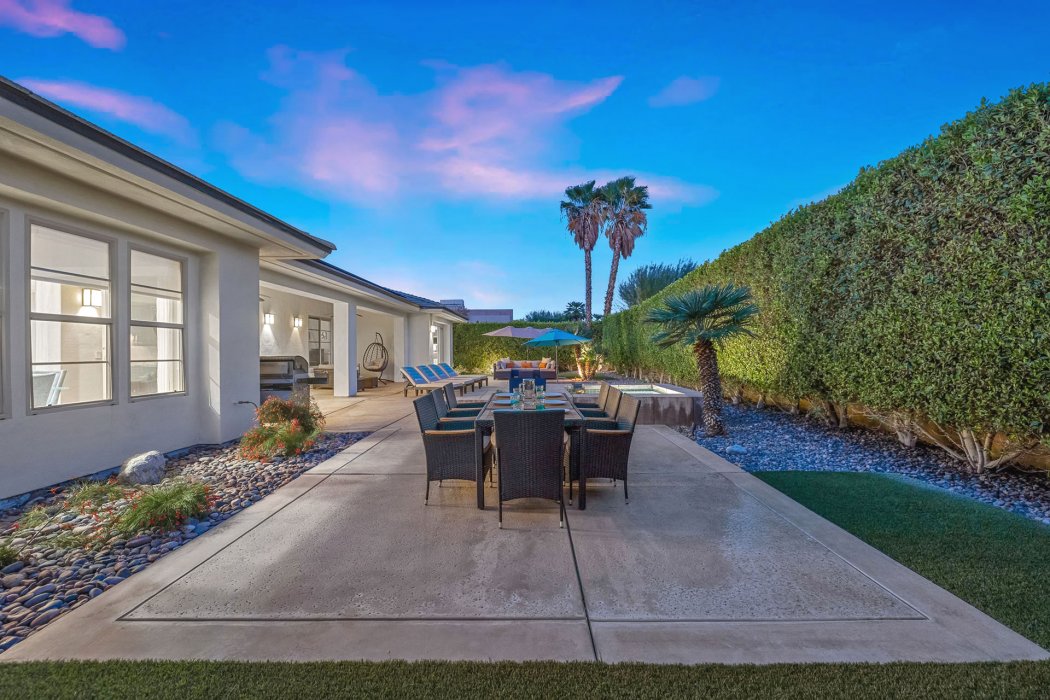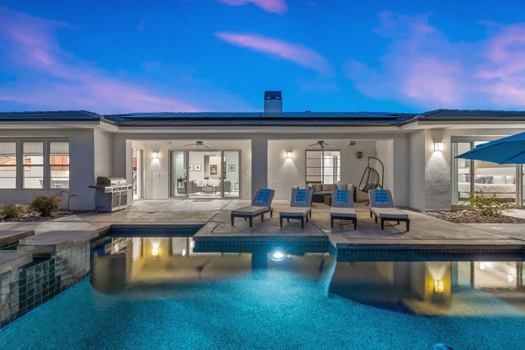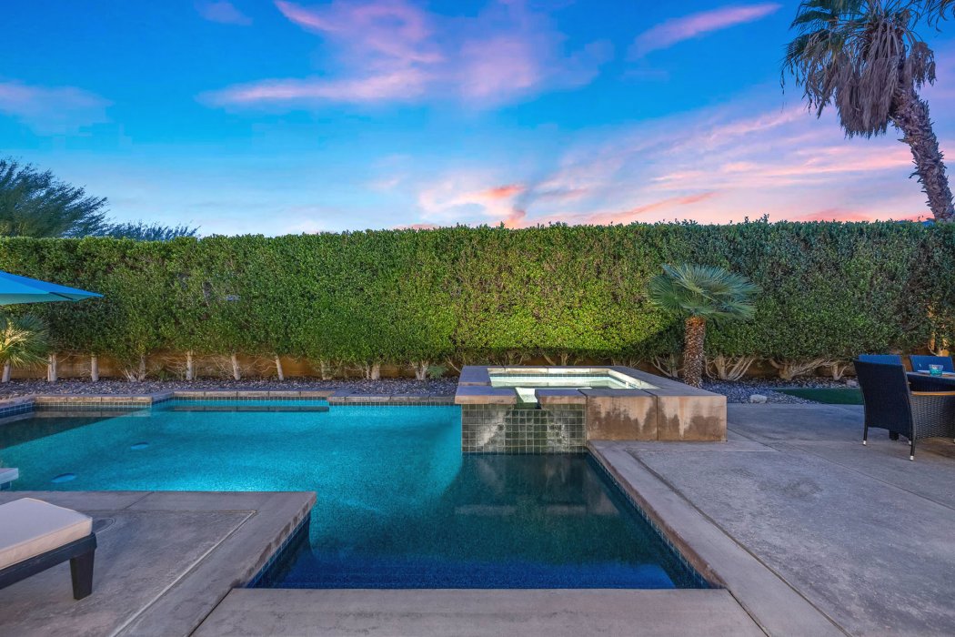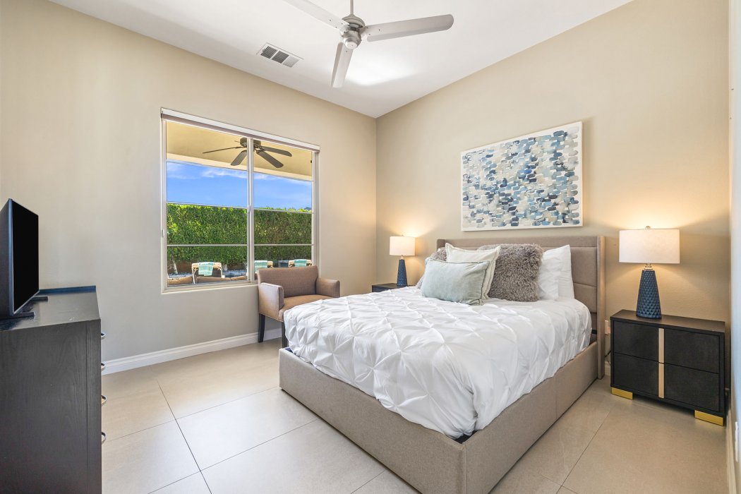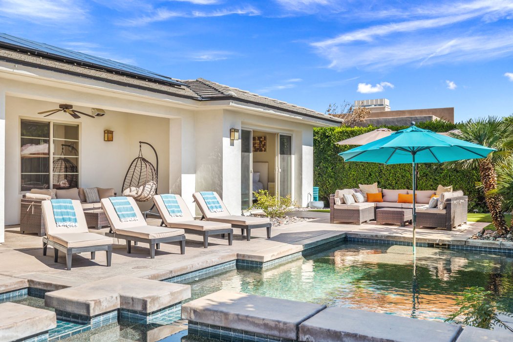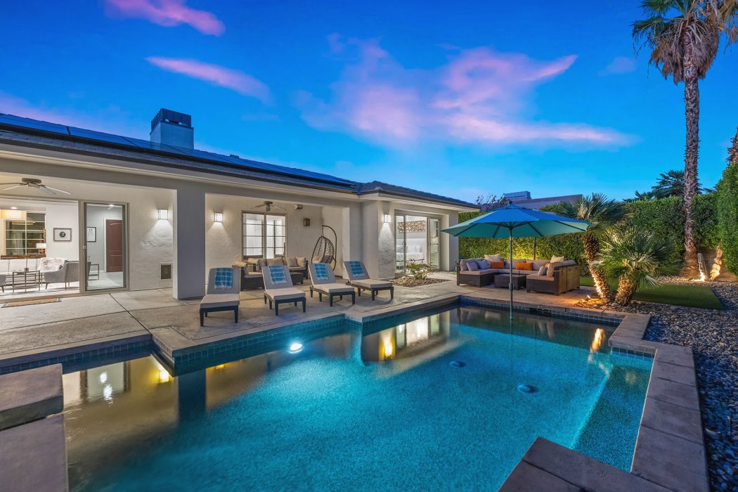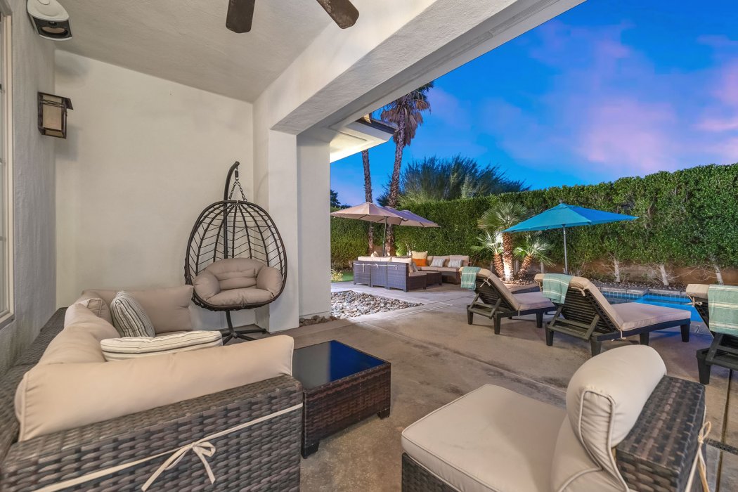 Outdoors enjoy unobstructed views of the majestic San Jacinto Mountains from the sparkling saline pool and spa. Spend sunny afternoons lounging on the comfortable chaise chairs or relaxing on the outdoor sofa. Gather around the dining table for an al fresco meal prepared on the BBQ grill. As the sun sets, retreat to the front courtyard firepit for cocktails and stargazing under the desert sky. The thoughtful layout of both the front and back outdoor areas creates the perfect blend of privacy and resort-style comfort.