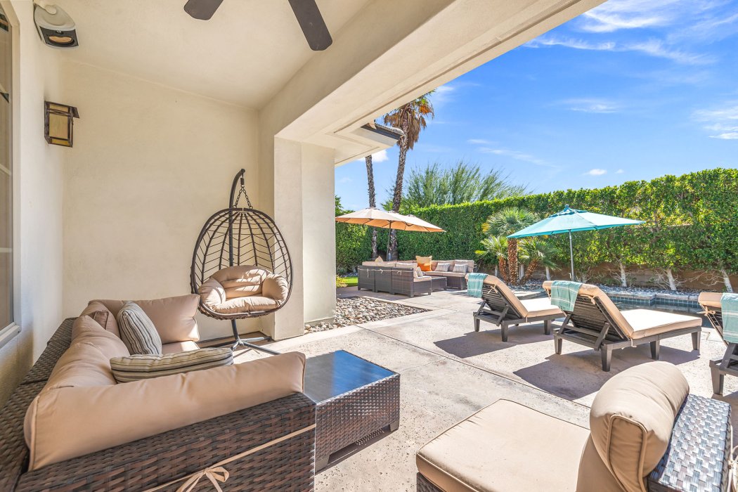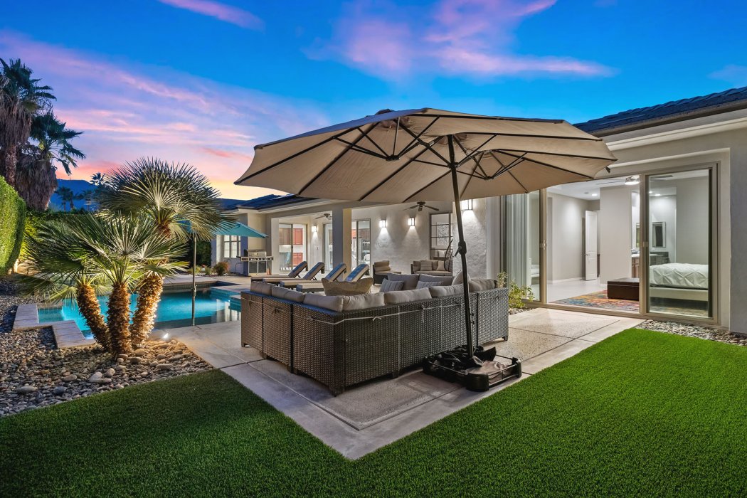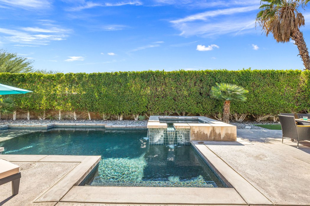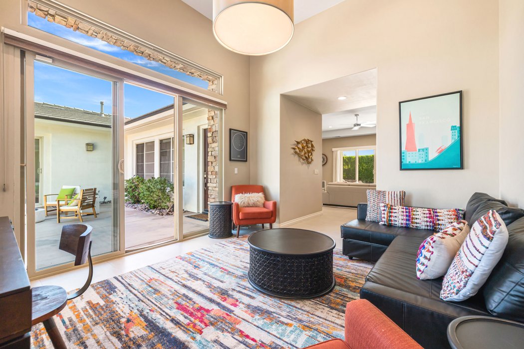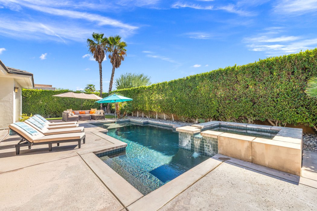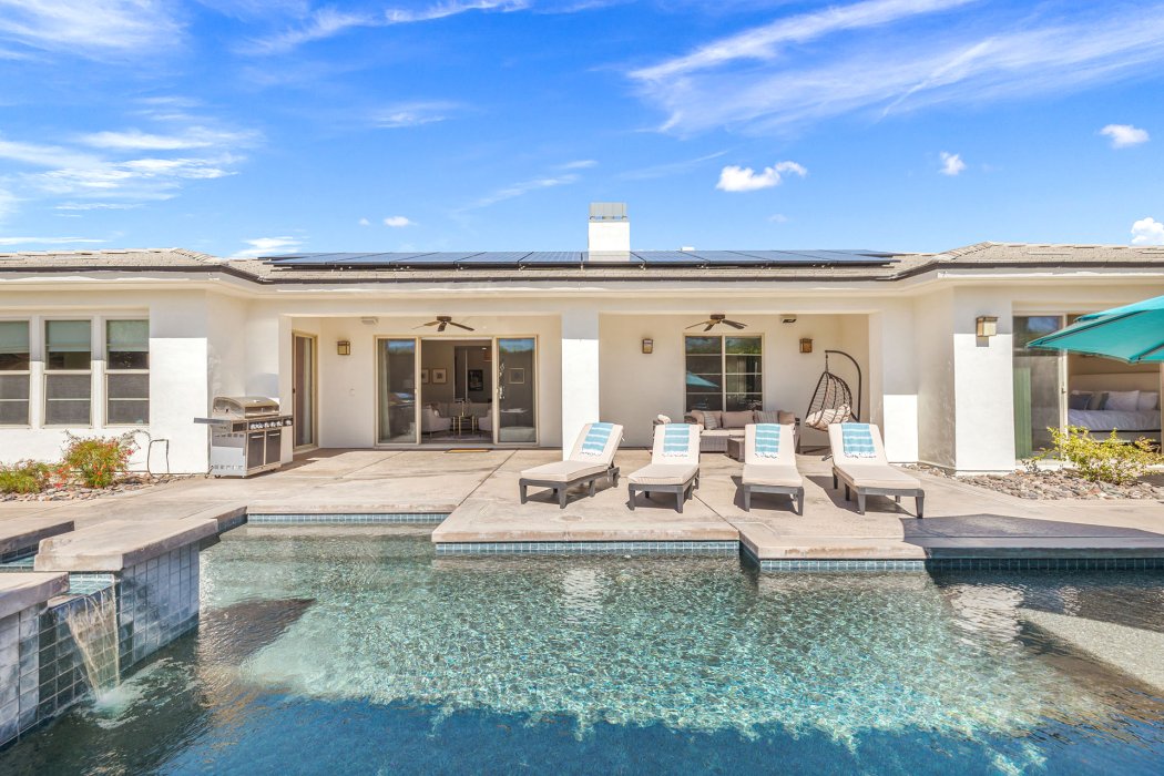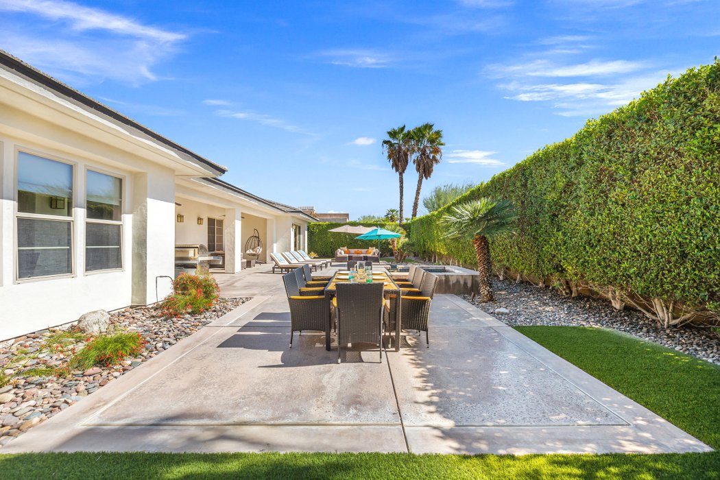 Outdoors enjoy unobstructed views of the majestic San Jacinto Mountains from the sparkling saline pool and spa. Spend sunny afternoons lounging on the comfortable chaise chairs or relaxing on the outdoor sofa. Gather around the dining table for an al fresco meal prepared on the BBQ grill. As the sun sets, retreat to the front courtyard firepit for cocktails and stargazing under the desert sky. The thoughtful layout of both the front and back outdoor areas creates the perfect blend of privacy and resort-style comfort.