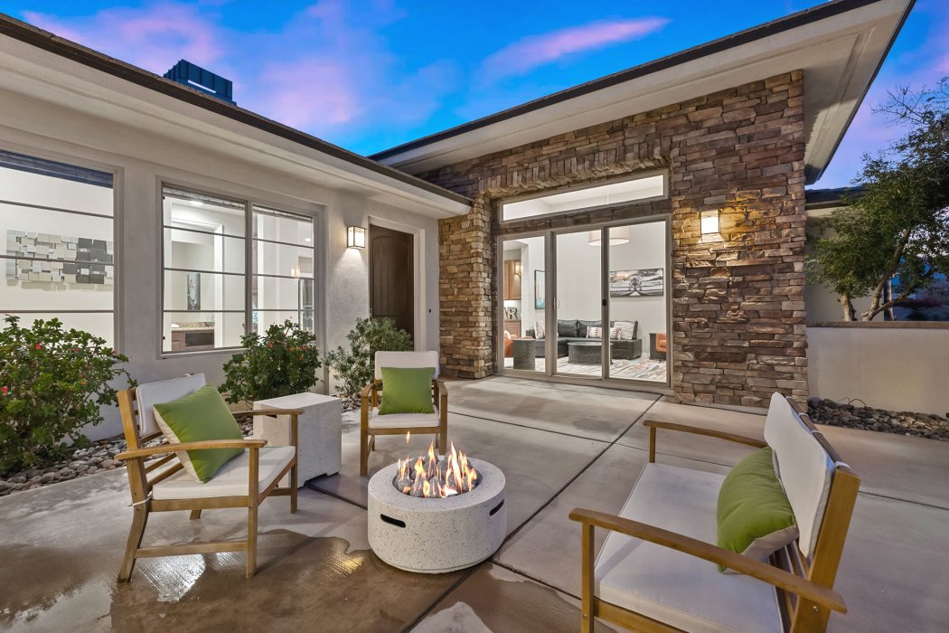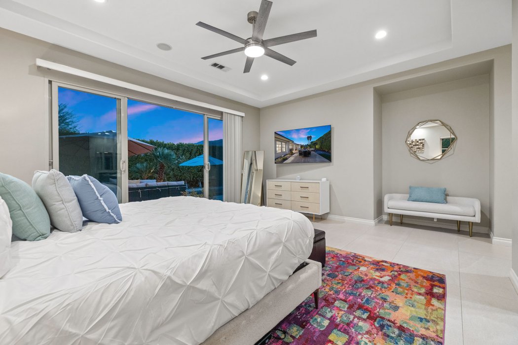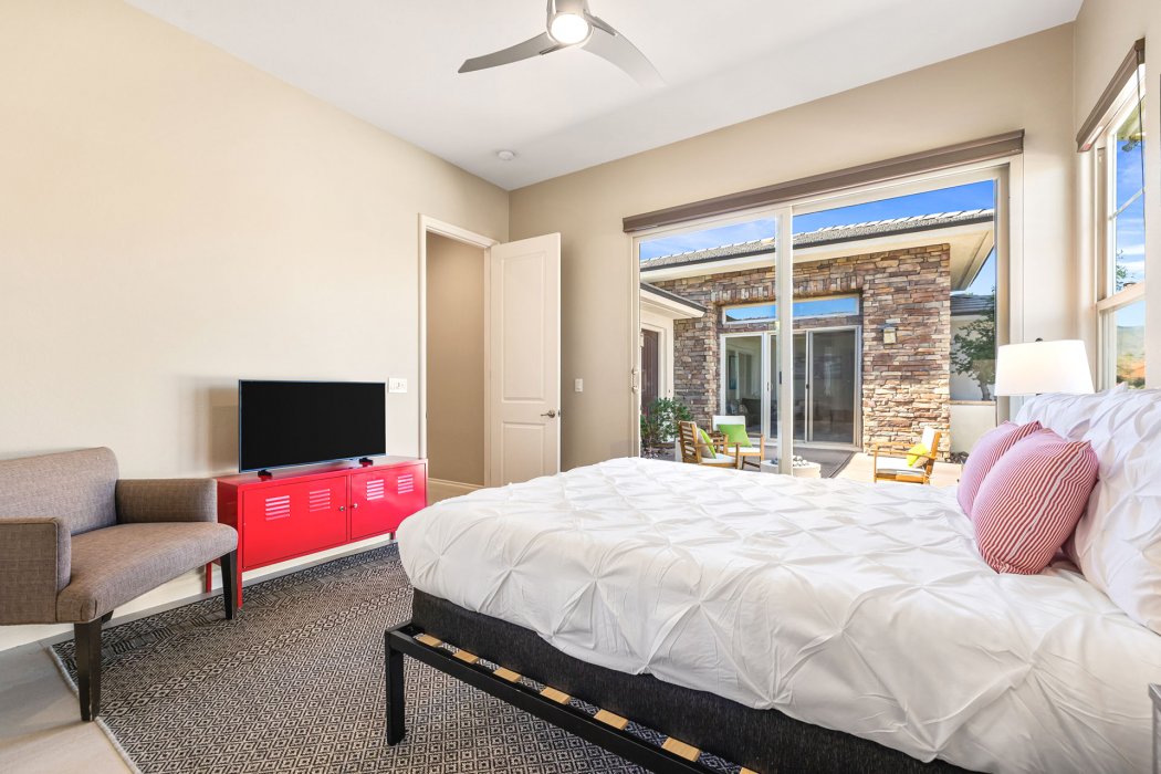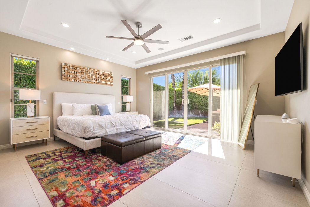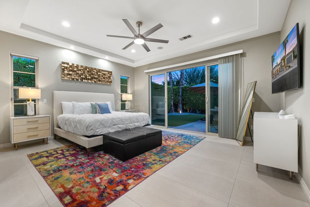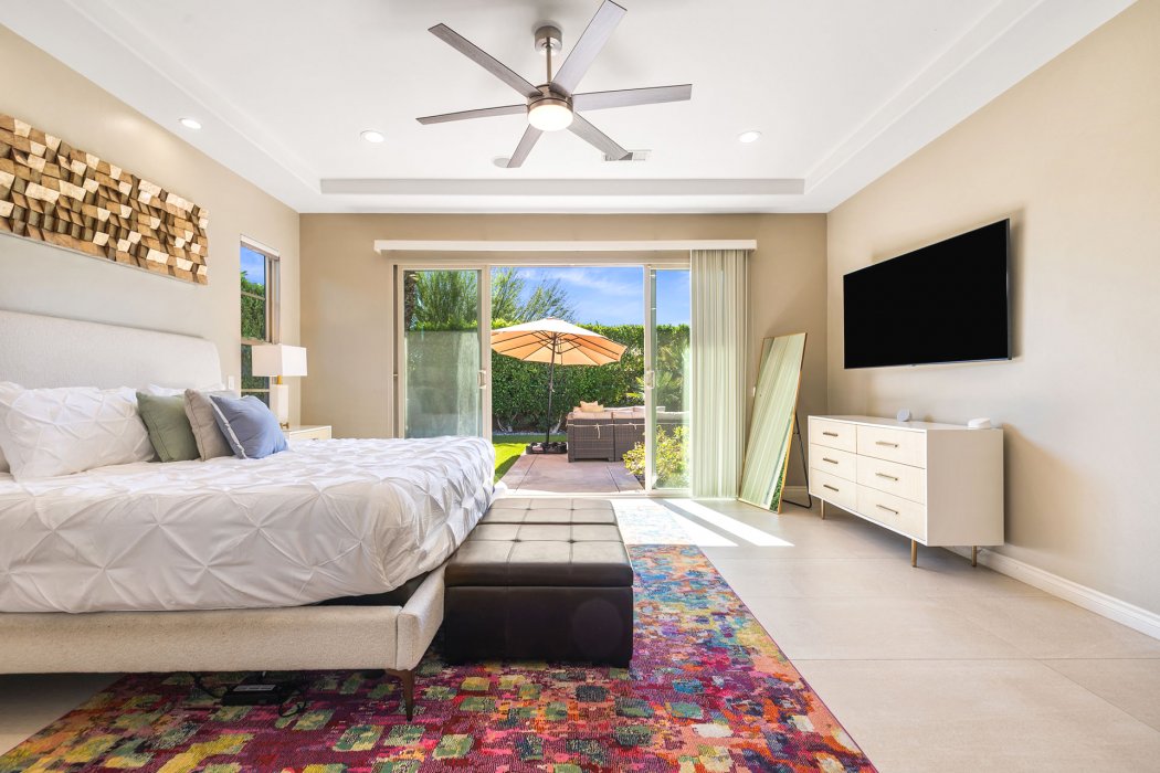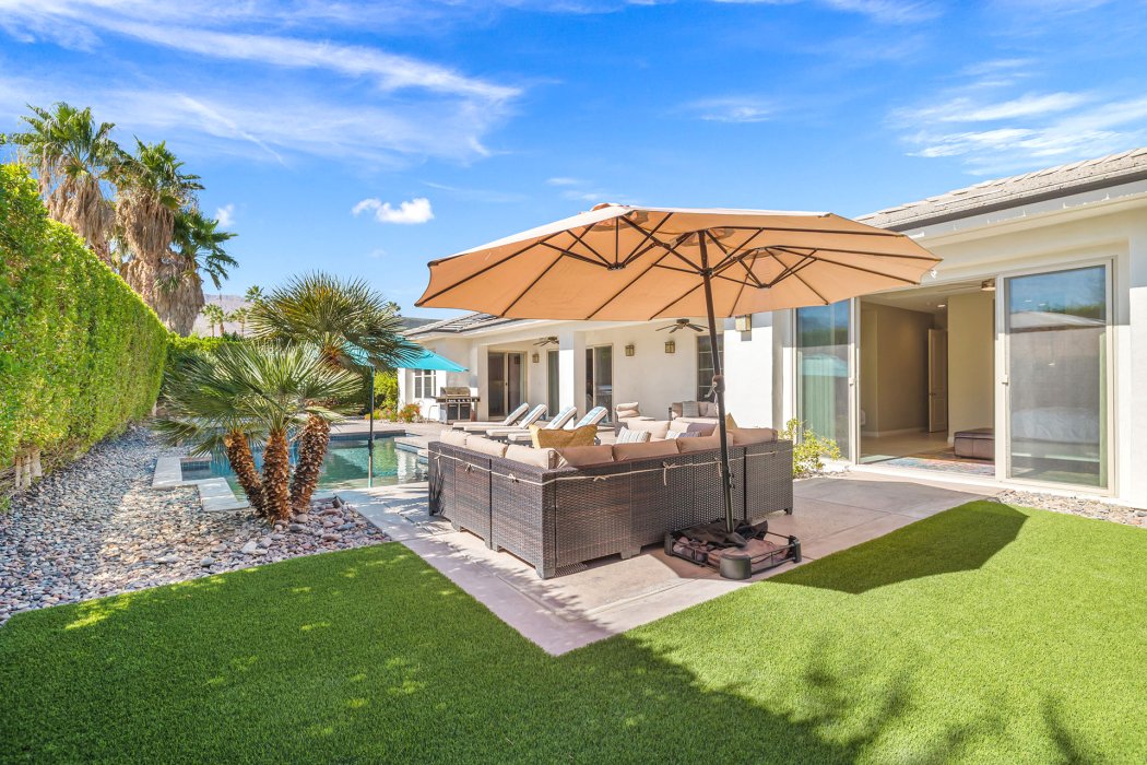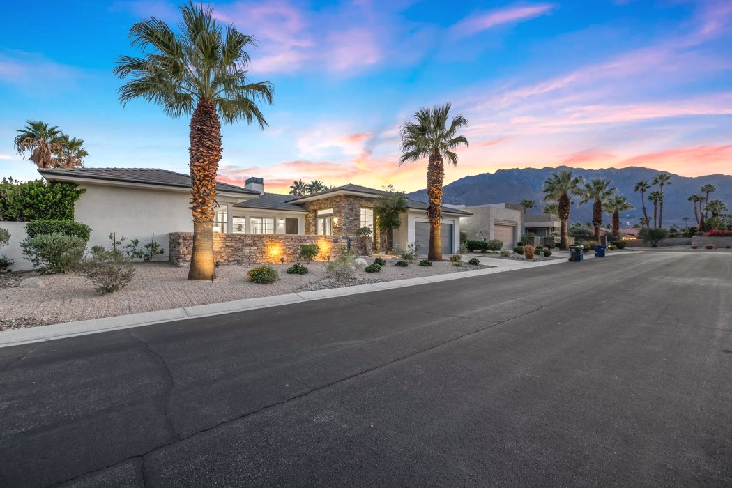 Outdoors enjoy unobstructed views of the majestic San Jacinto Mountains from the sparkling saline pool and spa. Spend sunny afternoons lounging on the comfortable chaise chairs or relaxing on the outdoor sofa. Gather around the dining table for an al fresco meal prepared on the BBQ grill. As the sun sets, retreat to the front courtyard firepit for cocktails and stargazing under the desert sky. The thoughtful layout of both the front and back outdoor areas creates the perfect blend of privacy and resort-style comfort.