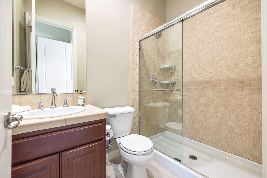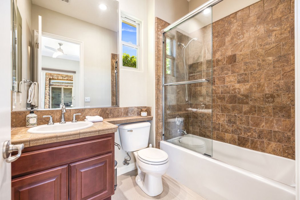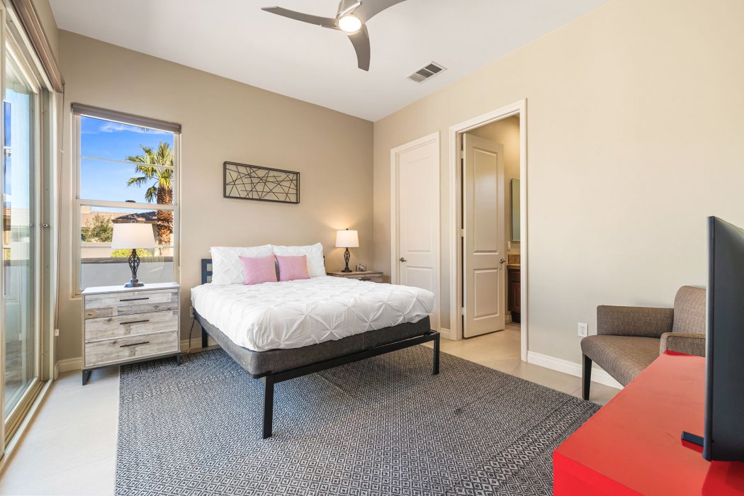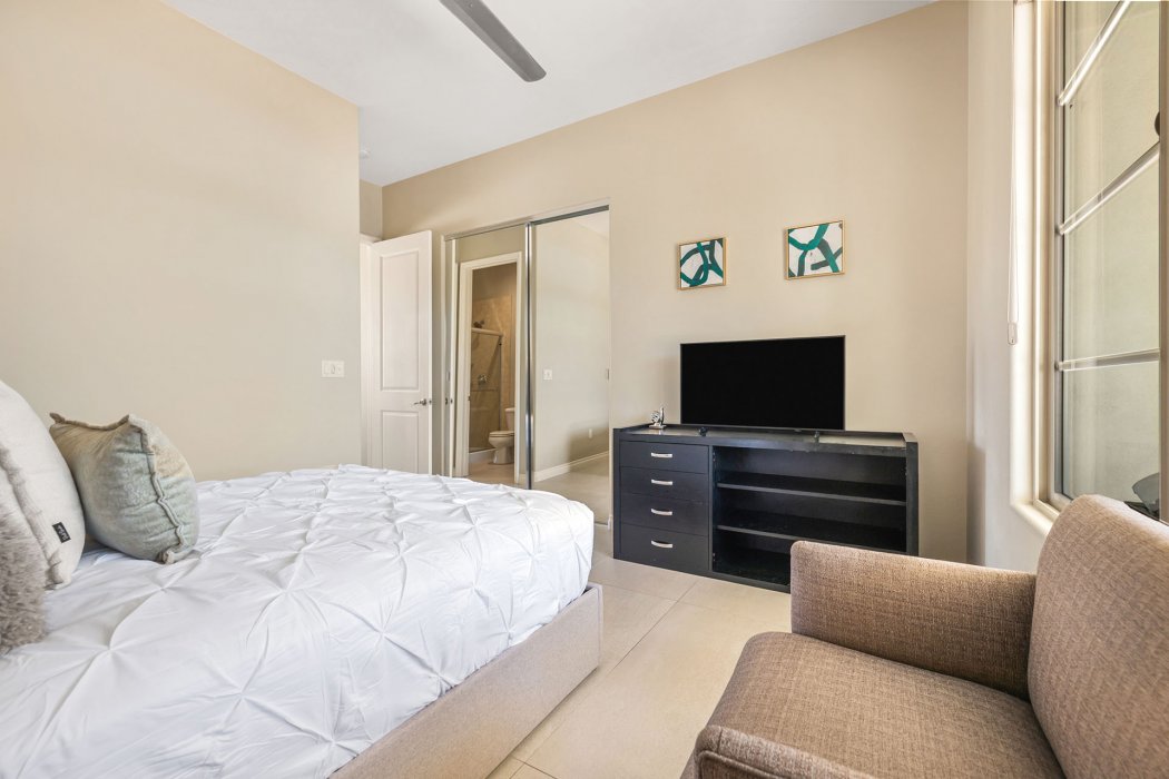 The Primary Suite has a King bed, flat-screen TV, and glass doors opening to the pool yard. The en suite bathroom features a large walk-in shower, soaking tub, and dual vanities. Bedroom 2 offers a Queen bed, TV, glass doors to the front courtyard, and an en suite bathroom with a walk-in shower. Bedroom 3 also includes a Queen bed, TV, and its own en suite bathroom with a shower. The sofa in the den lays flat to a full size bed.