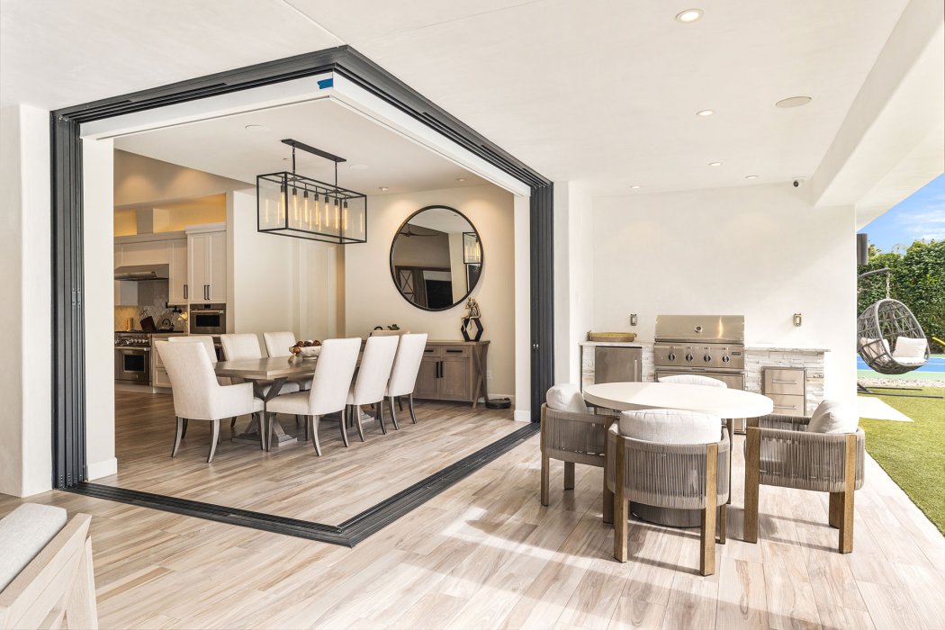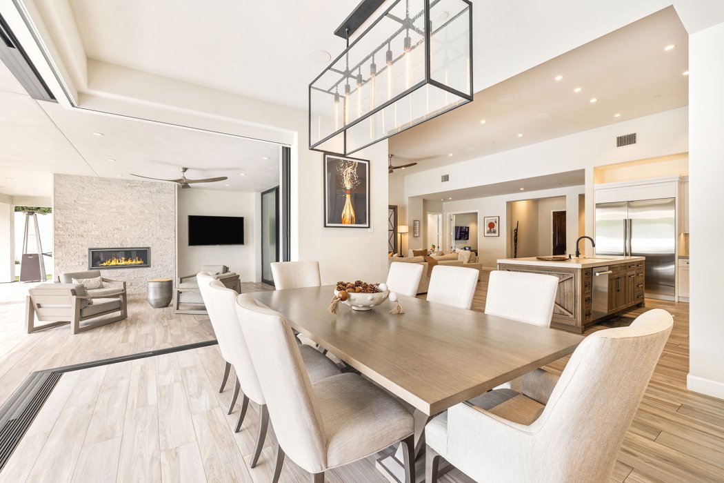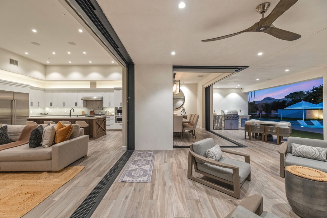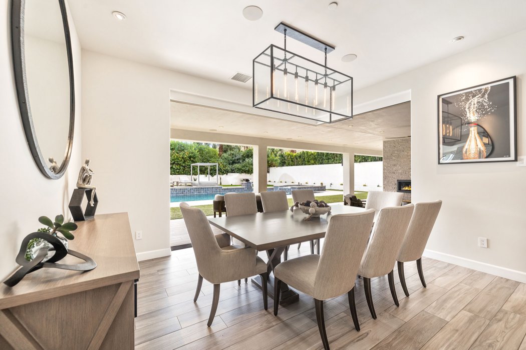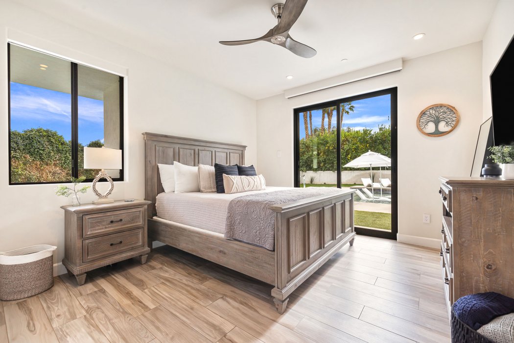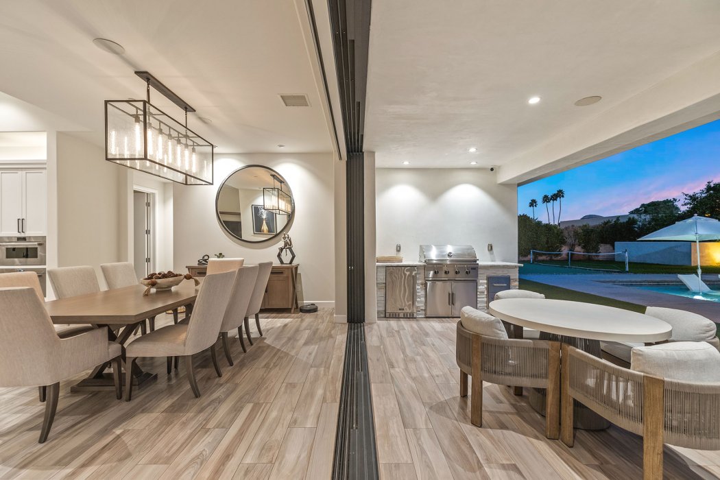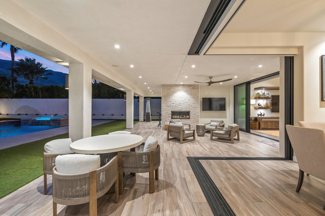Inside, Pura Vida embodies contemporary luxury with soaring ceilings, modern architectural lines, and expansive south-facing pocket doors that seamlessly blend indoor and outdoor living. The great room features comfortable designer furnishings, a striking fireplace, and a large TV, all framed by desert views. The gourmet chef’s kitchen is outfitted with Wolfe and Asko appliances, a Subzero refrigerator, quartz countertops, and an oversized island with seating for four. A separate wet bar with fridge, a large walk-in butler’s pantry, and the beautiful indoor outdoor dining room with seating for eight makes entertaining effortless.
