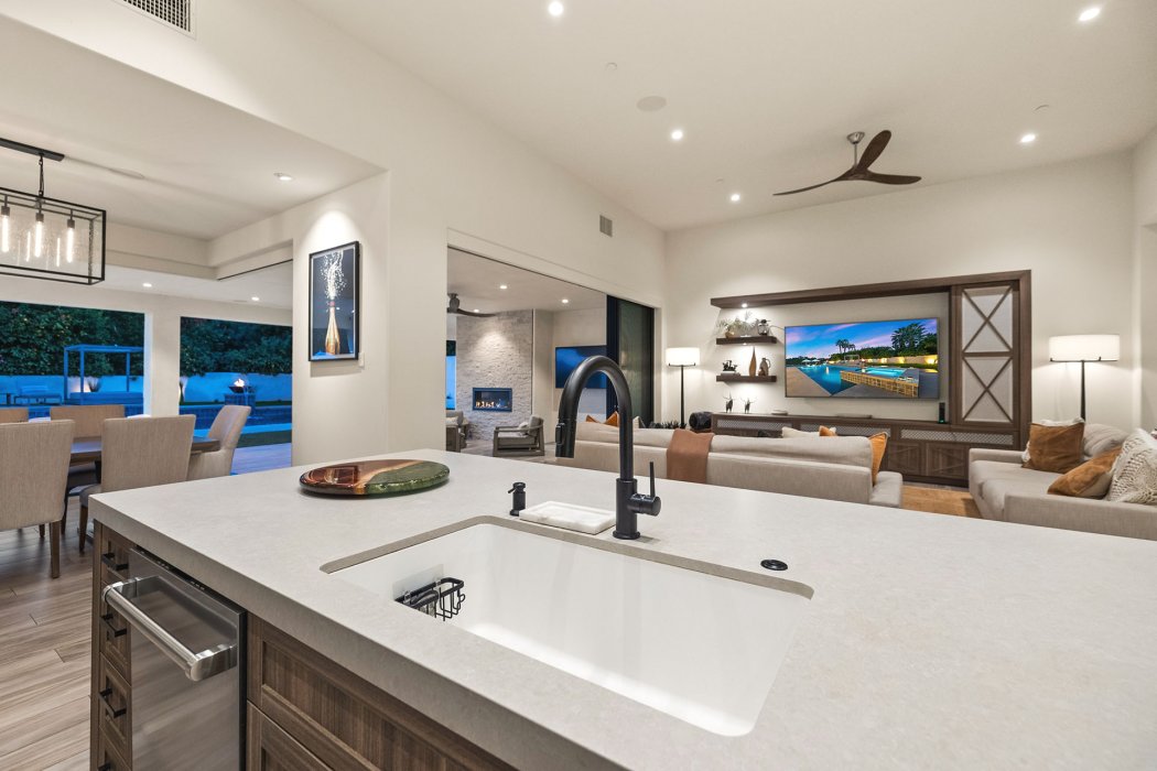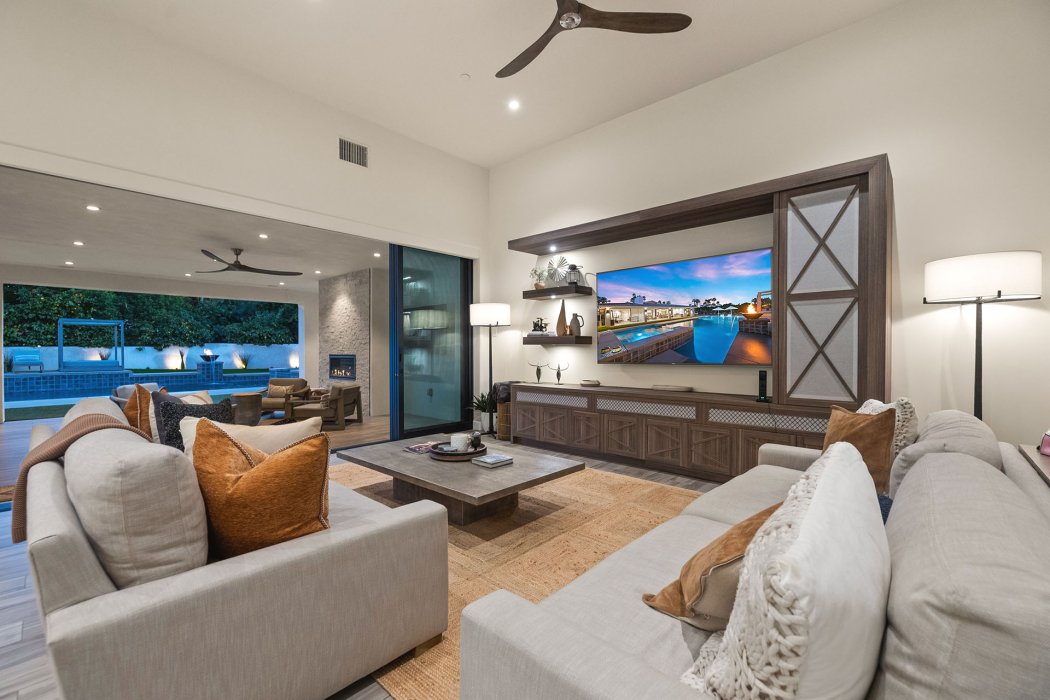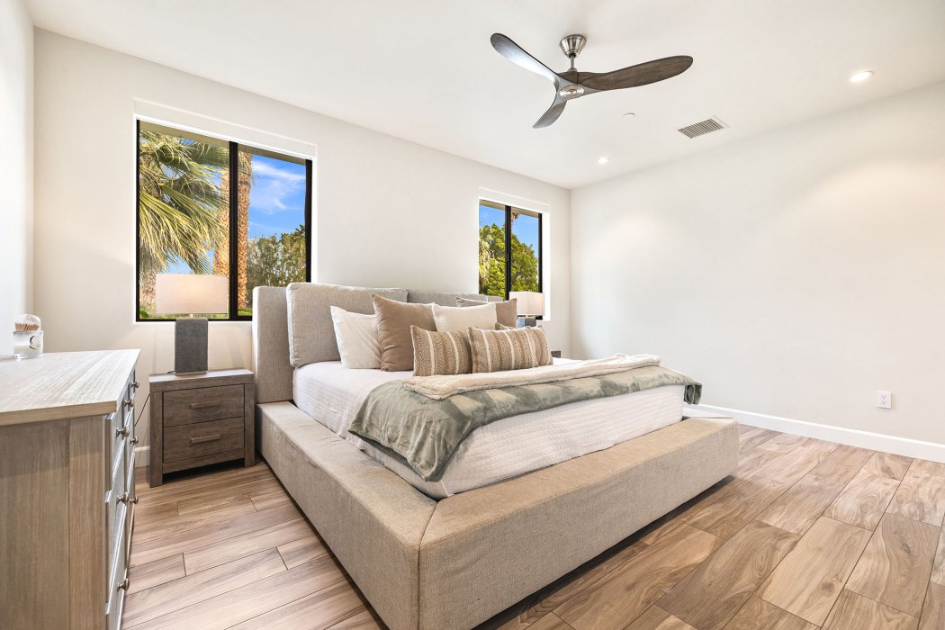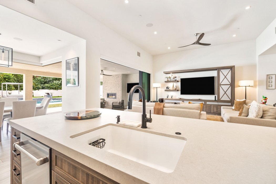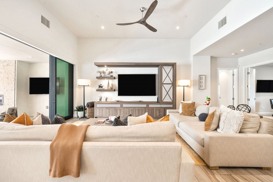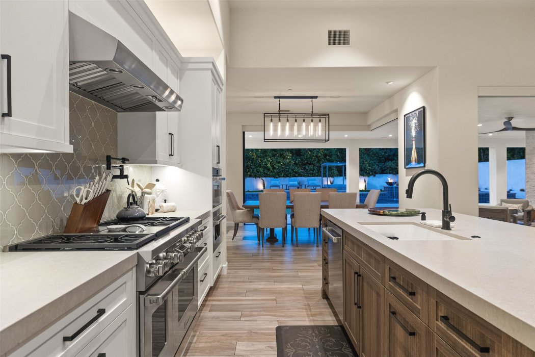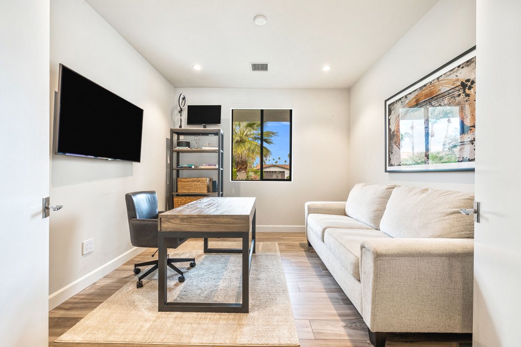 Inside, Pura Vida embodies contemporary luxury with soaring ceilings, modern architectural lines, and expansive south-facing pocket doors that seamlessly blend indoor and outdoor living. The great room features comfortable designer furnishings, a striking fireplace, and a large TV, all framed by desert views. The gourmet chef’s kitchen is outfitted with Wolfe and Asko appliances, a Subzero refrigerator, quartz countertops, and an oversized island with seating for four. A separate wet bar with fridge, a large walk-in butler’s pantry, and the beautiful indoor outdoor dining room with seating for eight makes entertaining effortless.