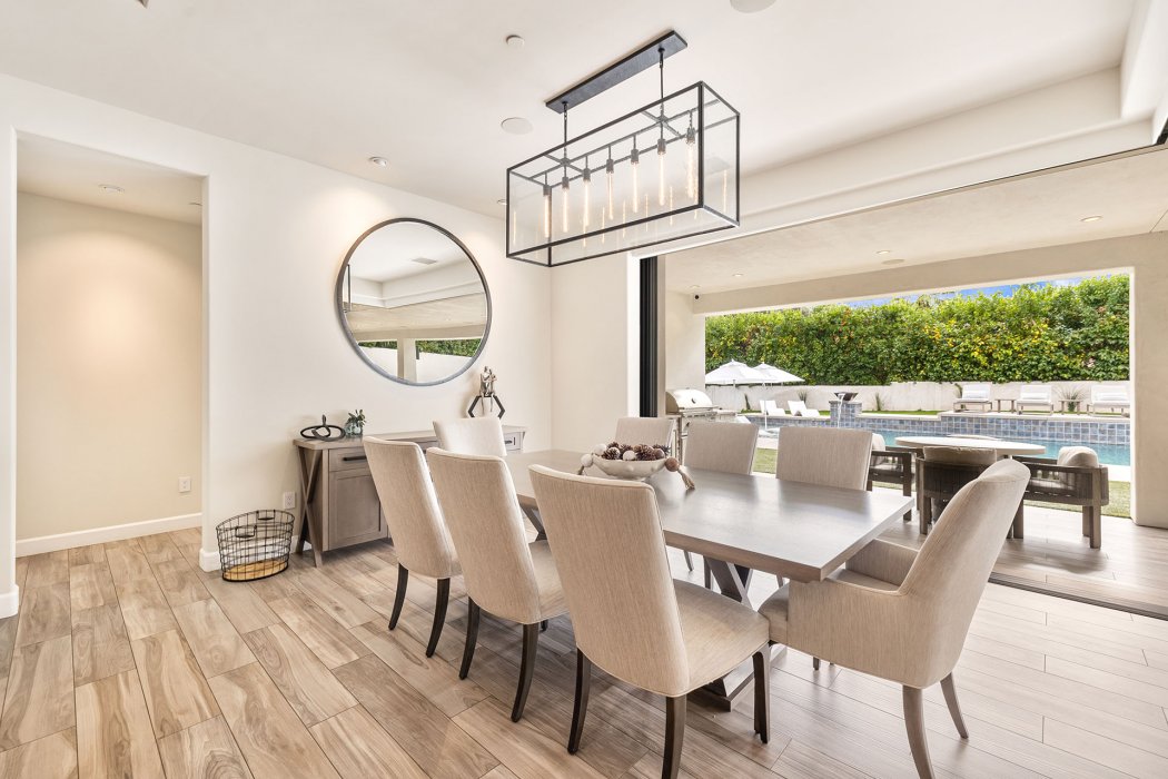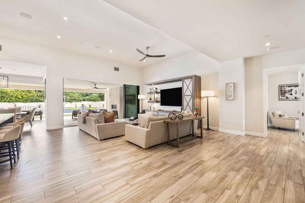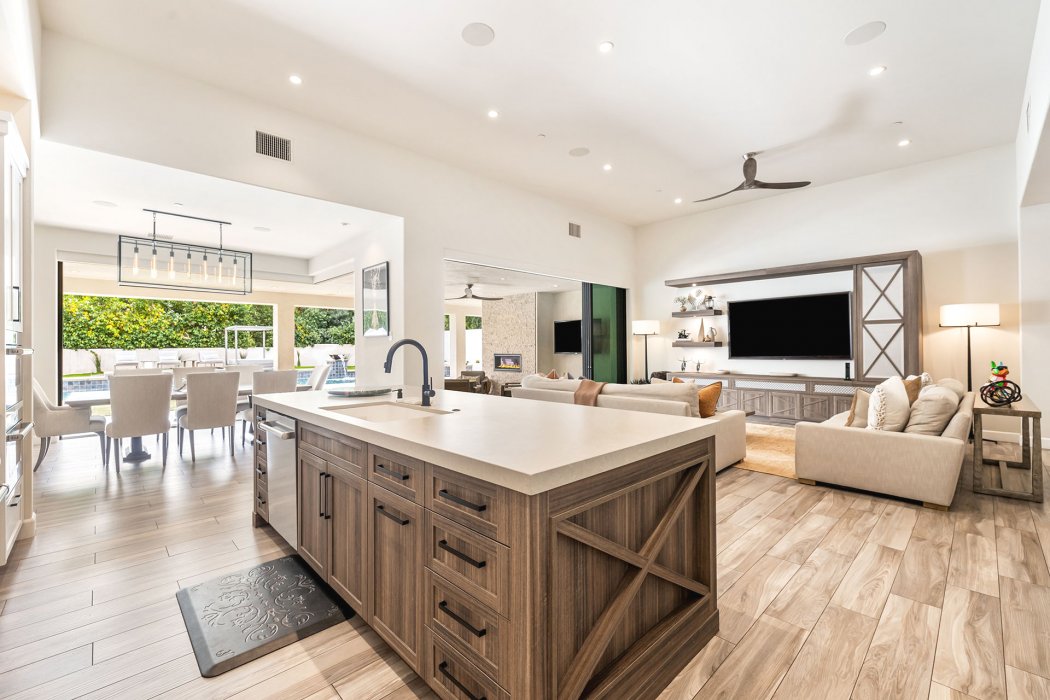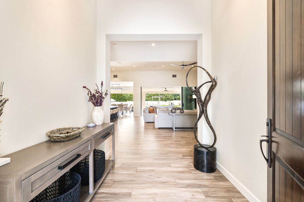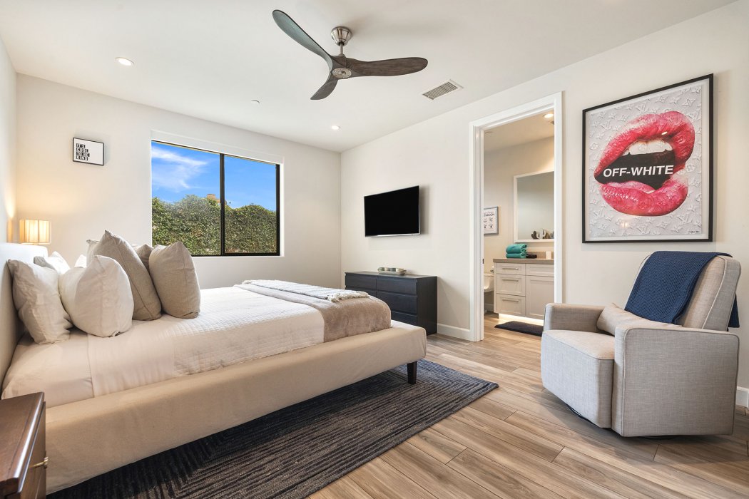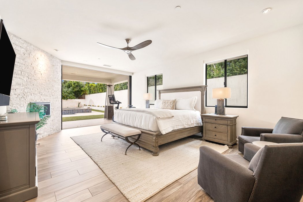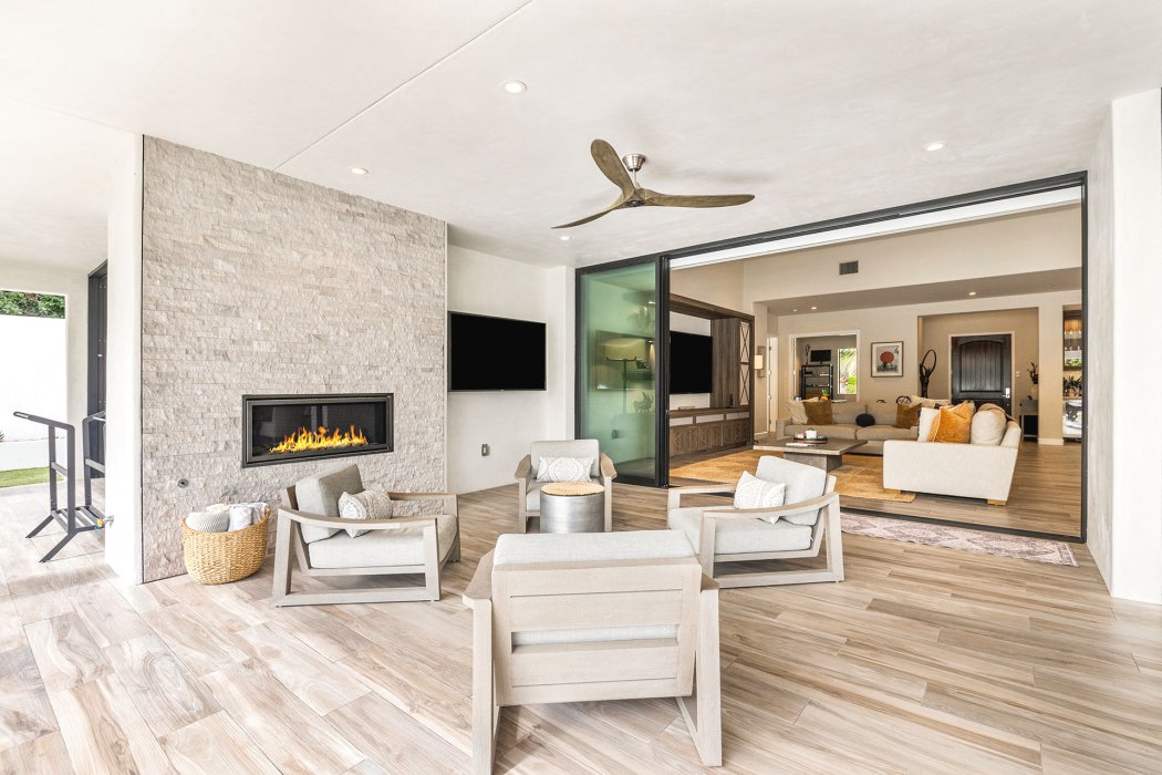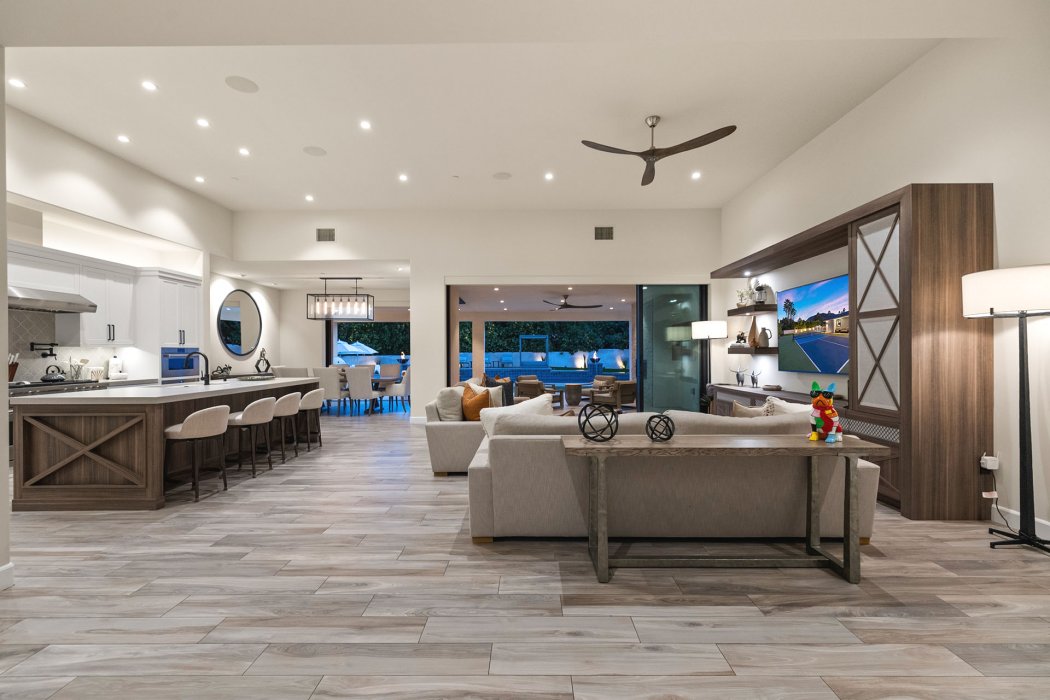 Inside, Pura Vida embodies contemporary luxury with soaring ceilings, modern architectural lines, and expansive south-facing pocket doors that seamlessly blend indoor and outdoor living. The great room features comfortable designer furnishings, a striking fireplace, and a large TV, all framed by desert views. The gourmet chef’s kitchen is outfitted with Wolfe and Asko appliances, a Subzero refrigerator, quartz countertops, and an oversized island with seating for four. A separate wet bar with fridge, a large walk-in butler’s pantry, and the beautiful indoor outdoor dining room with seating for eight makes entertaining effortless.