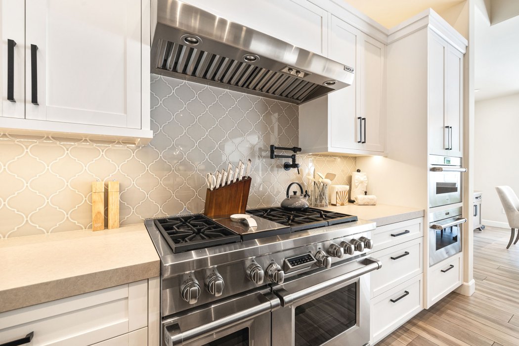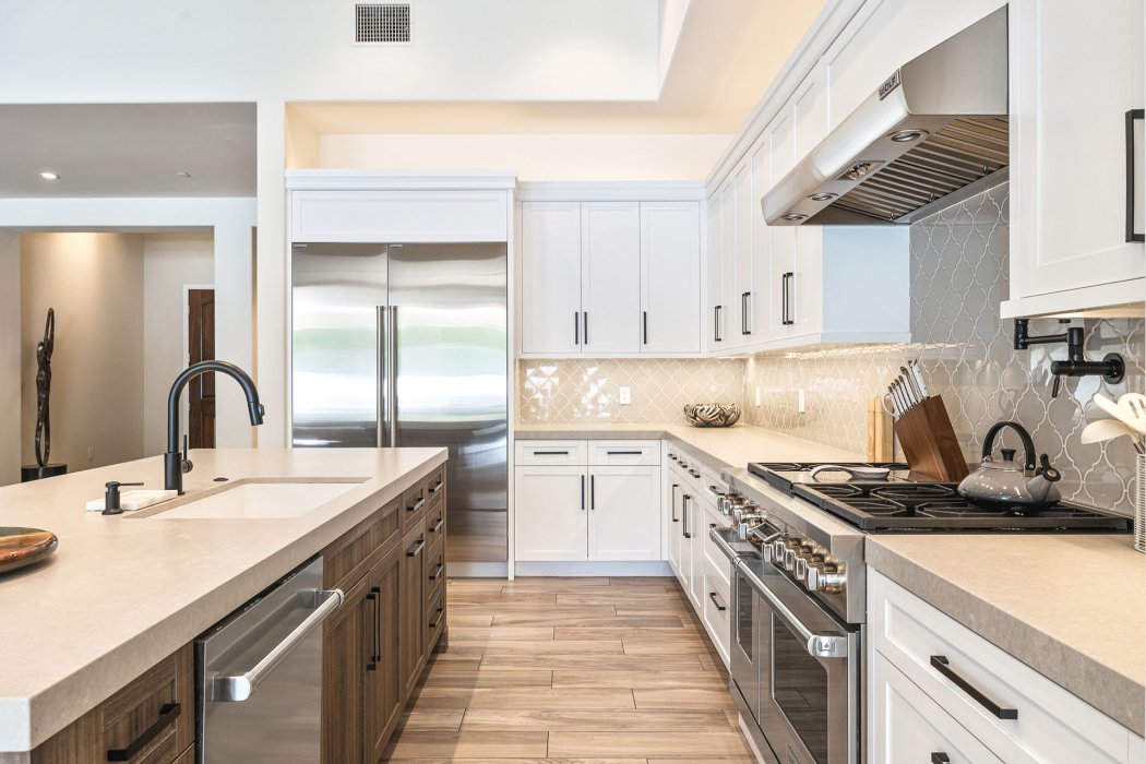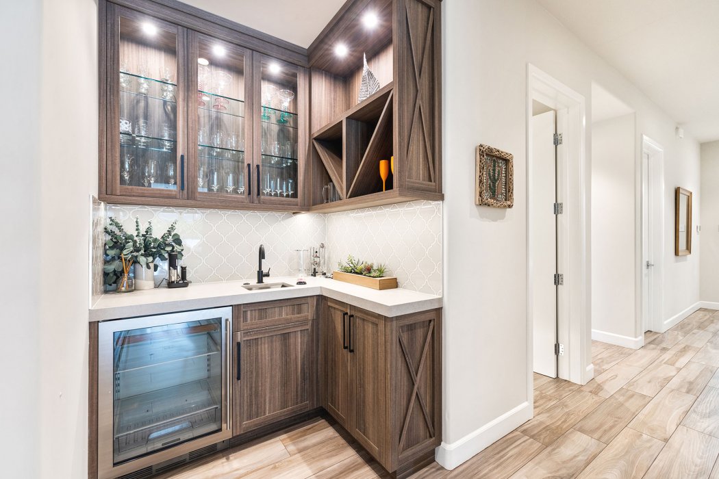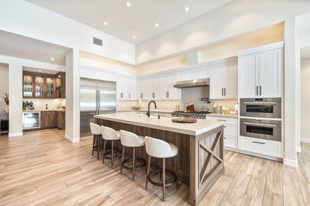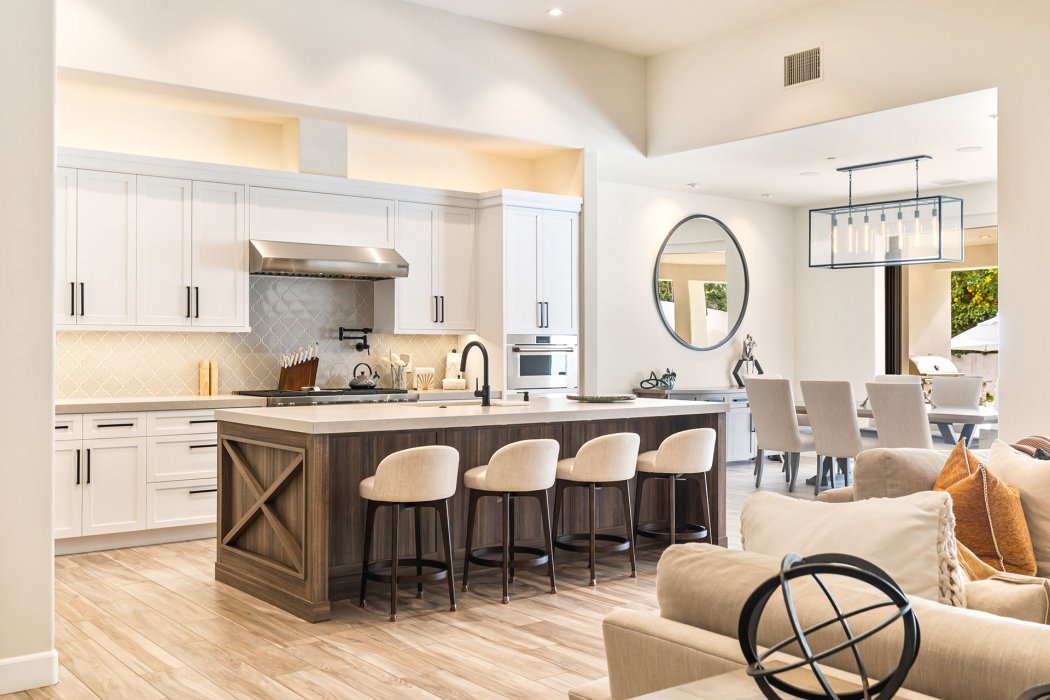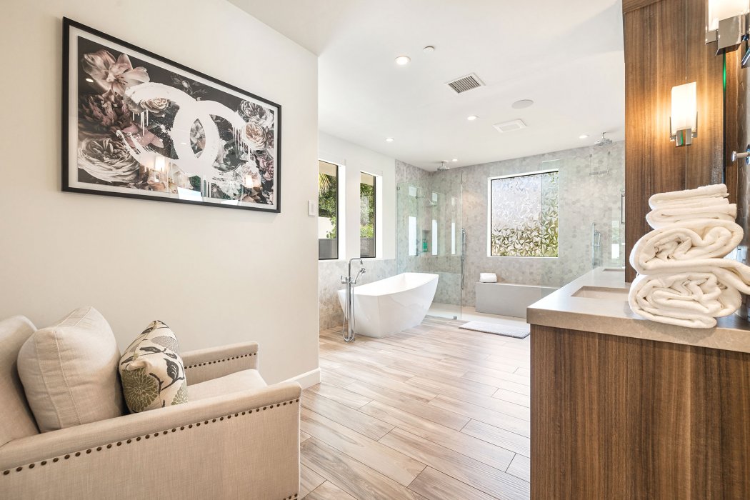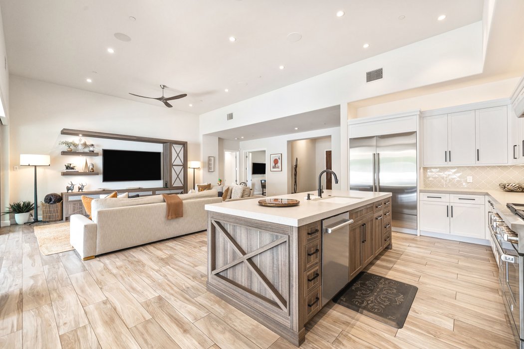 Inside, Pura Vida embodies contemporary luxury with soaring ceilings, modern architectural lines, and expansive south-facing pocket doors that seamlessly blend indoor and outdoor living. The great room features comfortable designer furnishings, a striking fireplace, and a large TV, all framed by desert views. The gourmet chef’s kitchen is outfitted with Wolfe and Asko appliances, a Subzero refrigerator, quartz countertops, and an oversized island with seating for four. A separate wet bar with fridge, a large walk-in butler’s pantry, and the beautiful indoor outdoor dining room with seating for eight makes entertaining effortless.