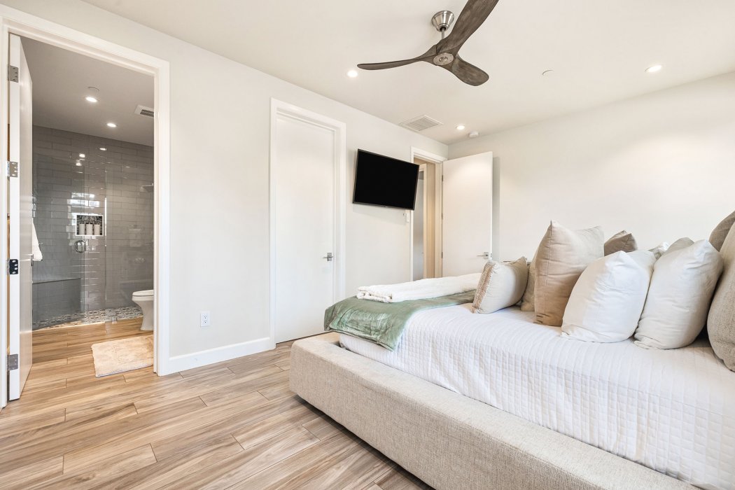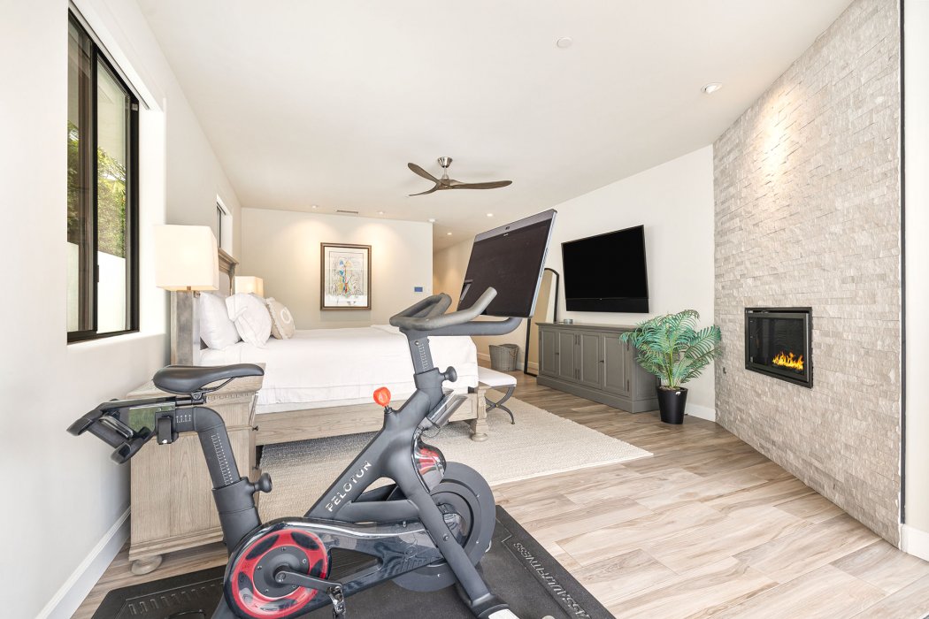 The Primary Suite offers a luxurious retreat featuring a king bed, TV, fireplace, and sliding doors leading directly to the pool, plus an en suite bathroom with a soaking tub, walk-in shower, and generous closet space. It also has a Peloton bike. Suite 2 features a king bed, TV, and an en suite bathroom with a walk-in shower. Suite 3 also includes a king bed, TV, and private en suite bath with a shower. Bedroom 4 provides a king bed, TV, and convenient access to the hall bathroom with a walk-in shower. Each bedroom is designed with comfort and privacy in mind.
