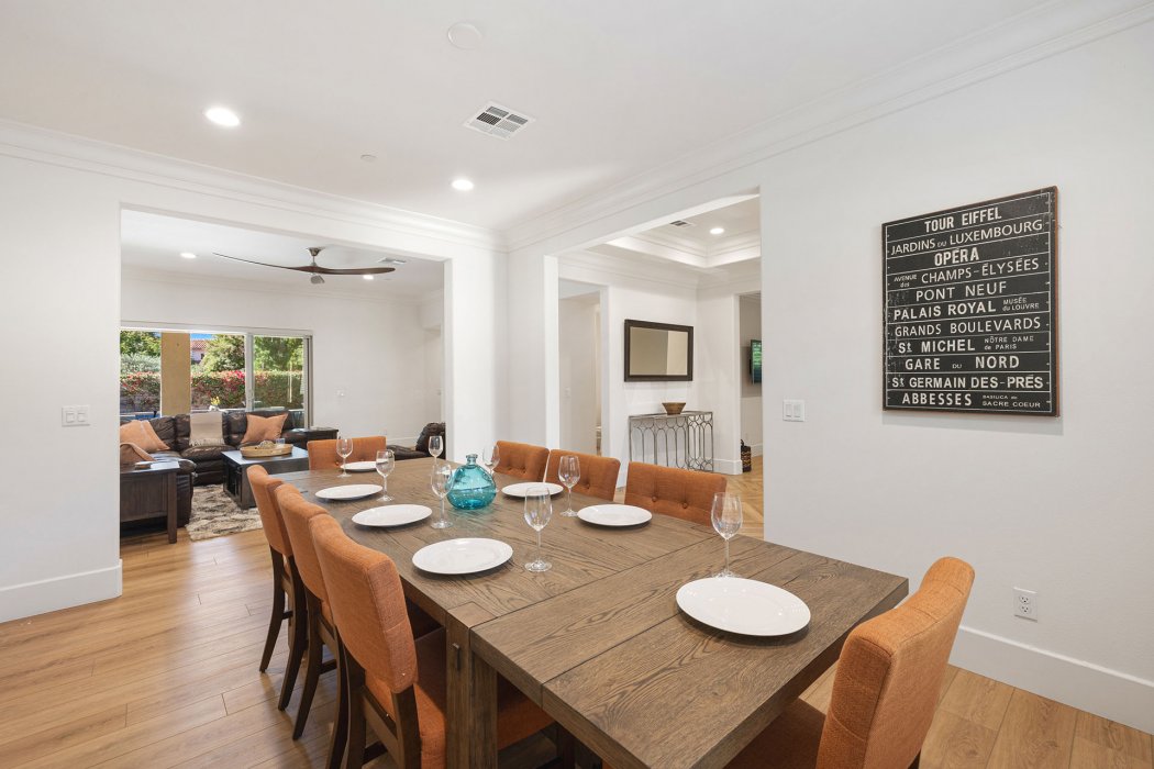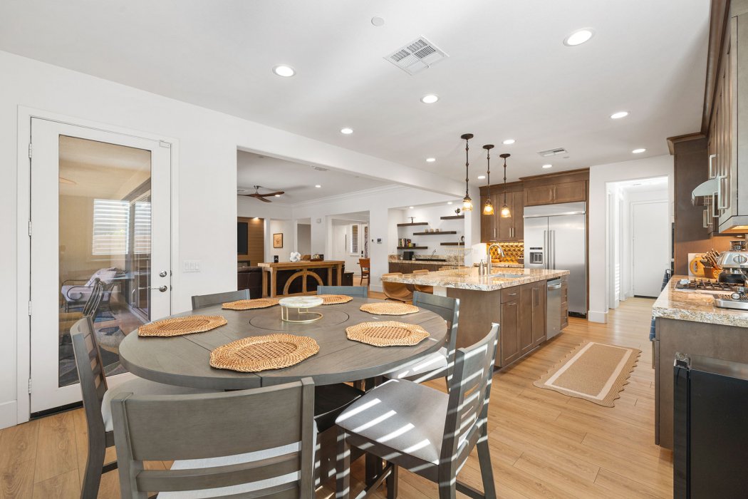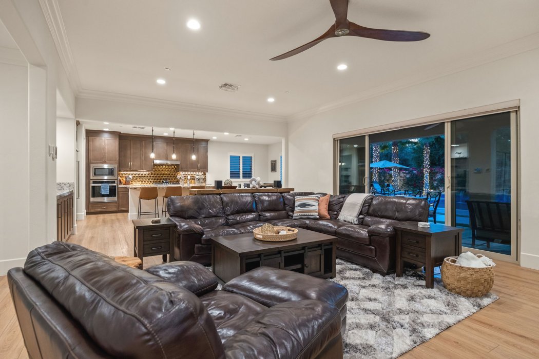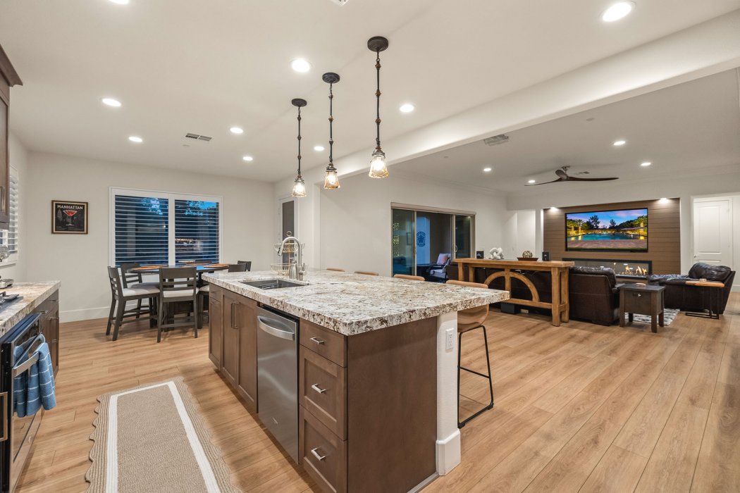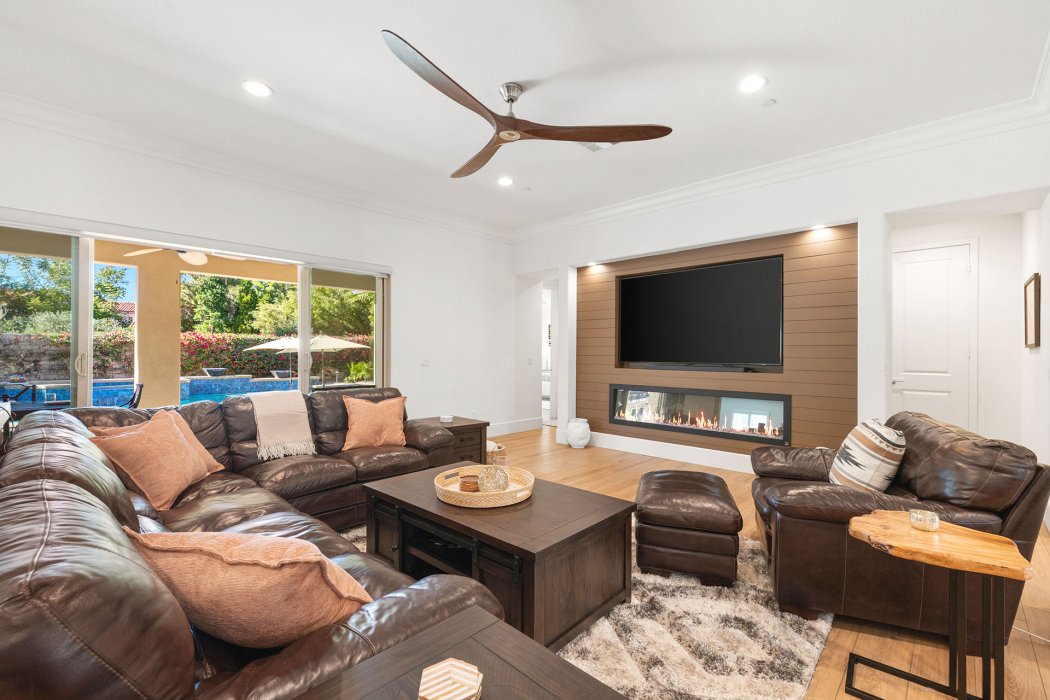 Indoors, the open-concept living area boasts a custom entertainment center, modern fireplace, and comfortable seating - all with picturesque views of the pool yard. The fully equipped kitchen is perfect for preparing meals and entertaining, featuring a kitchen table with seating for six, a breakfast bar with seating for four, and an adjacent dining room with seating for eight. Every space is thoughtfully designed to feel both stylish and welcoming, ideal for groups and families.