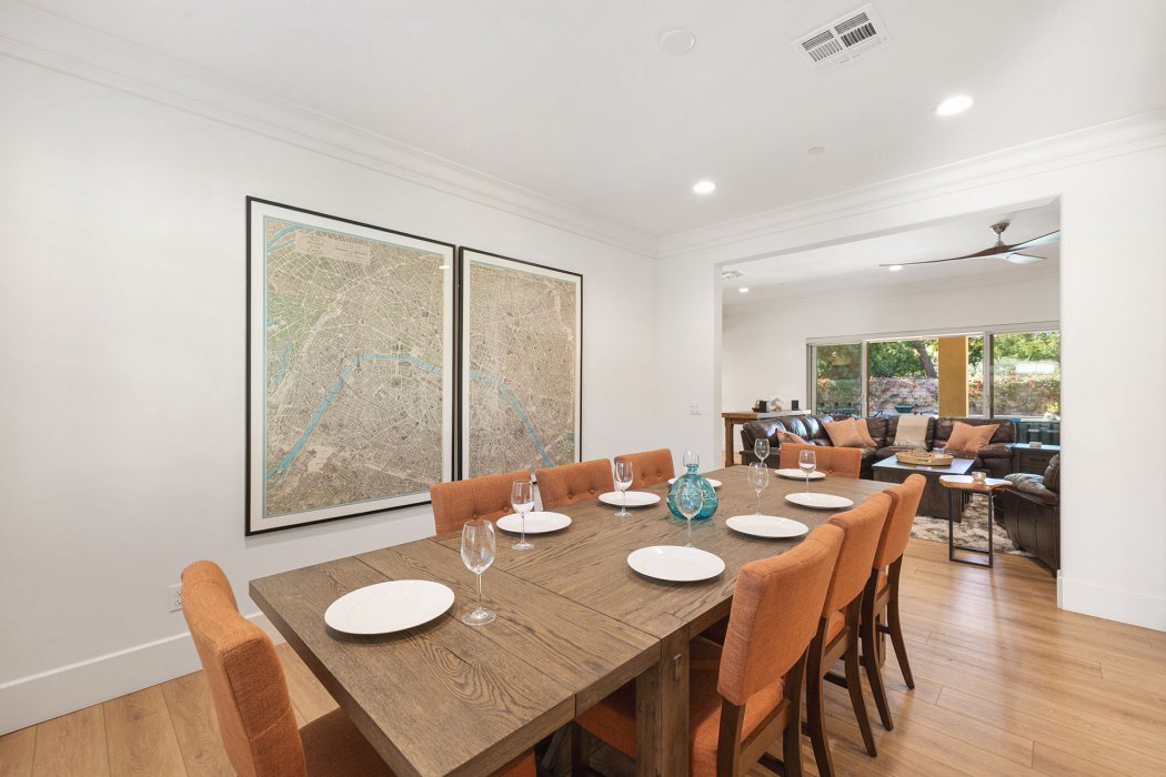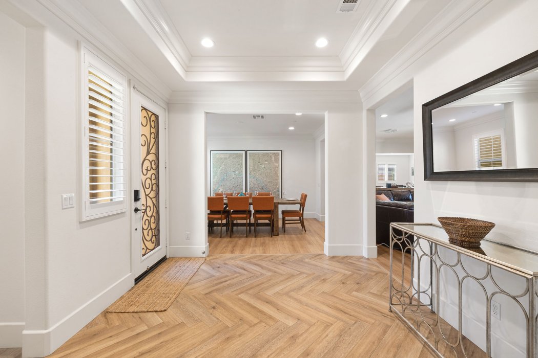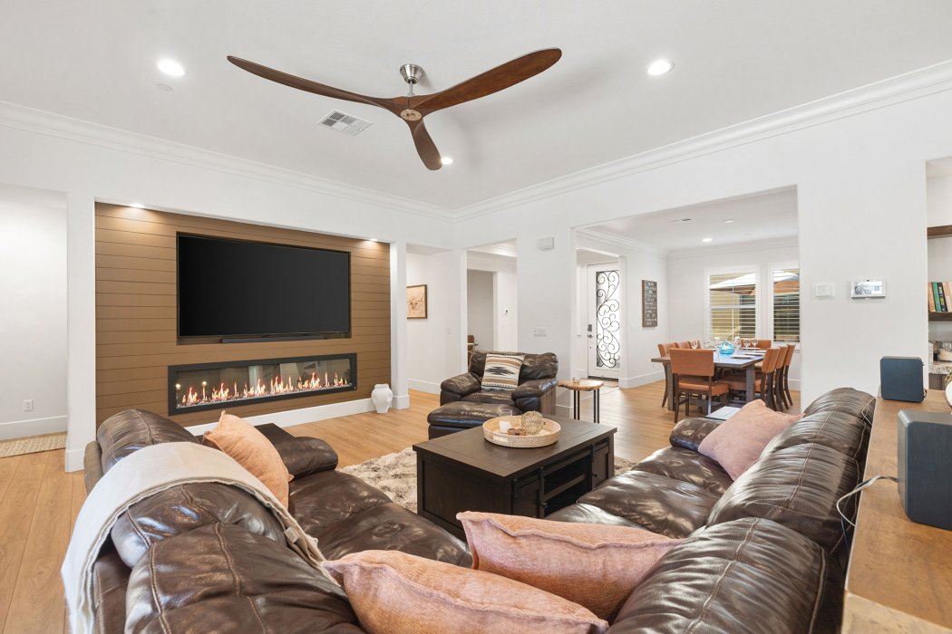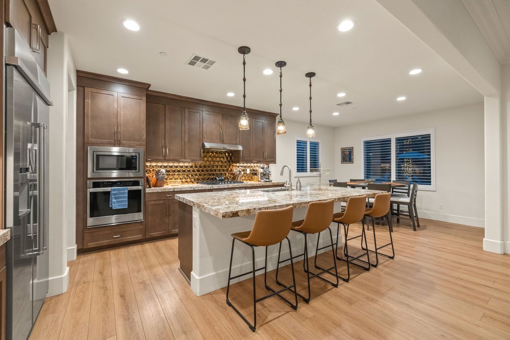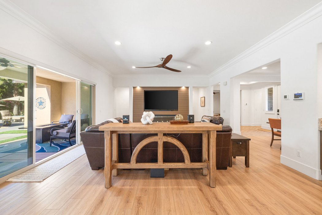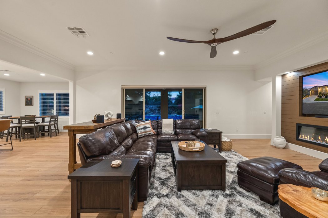 Indoors, the open-concept living area boasts a custom entertainment center, modern fireplace, and comfortable seating - all with picturesque views of the pool yard. The fully equipped kitchen is perfect for preparing meals and entertaining, featuring a kitchen table with seating for six, a breakfast bar with seating for four, and an adjacent dining room with seating for eight. Every space is thoughtfully designed to feel both stylish and welcoming, ideal for groups and families.