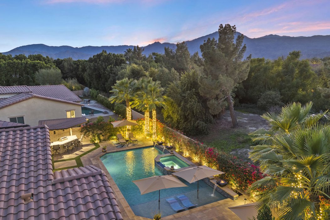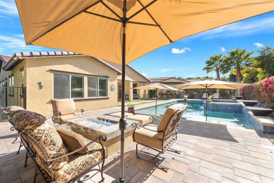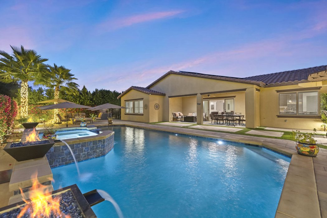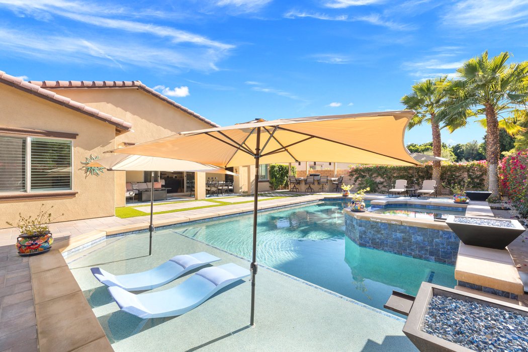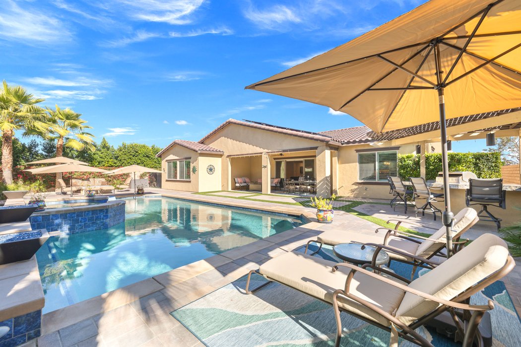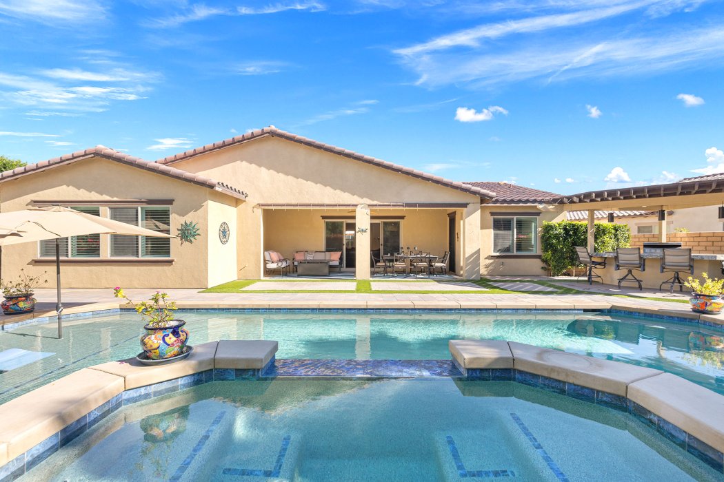 Welcome to Mosaic, a 4 bedroom 3.5 bath desert retreat designed for relaxing in the sun! Outdoors you’ll enjoy a sparkling pool and spa with dramatic fire and water features, BBQ island with seating, multiple firepit lounges, outdoor dining and seating, mature palms with twinkling lights, and sweeping mountain views. Inside, the home features an open concept floorplan with fully equipped kitchen, great room, dining room, media room and comfortable bedrooms. Situated on a generous quarter acre lot, and walking distance to the Coachella Festival grounds, Mosaic offers privacy, elegance, and effortless indoor-outdoor living.