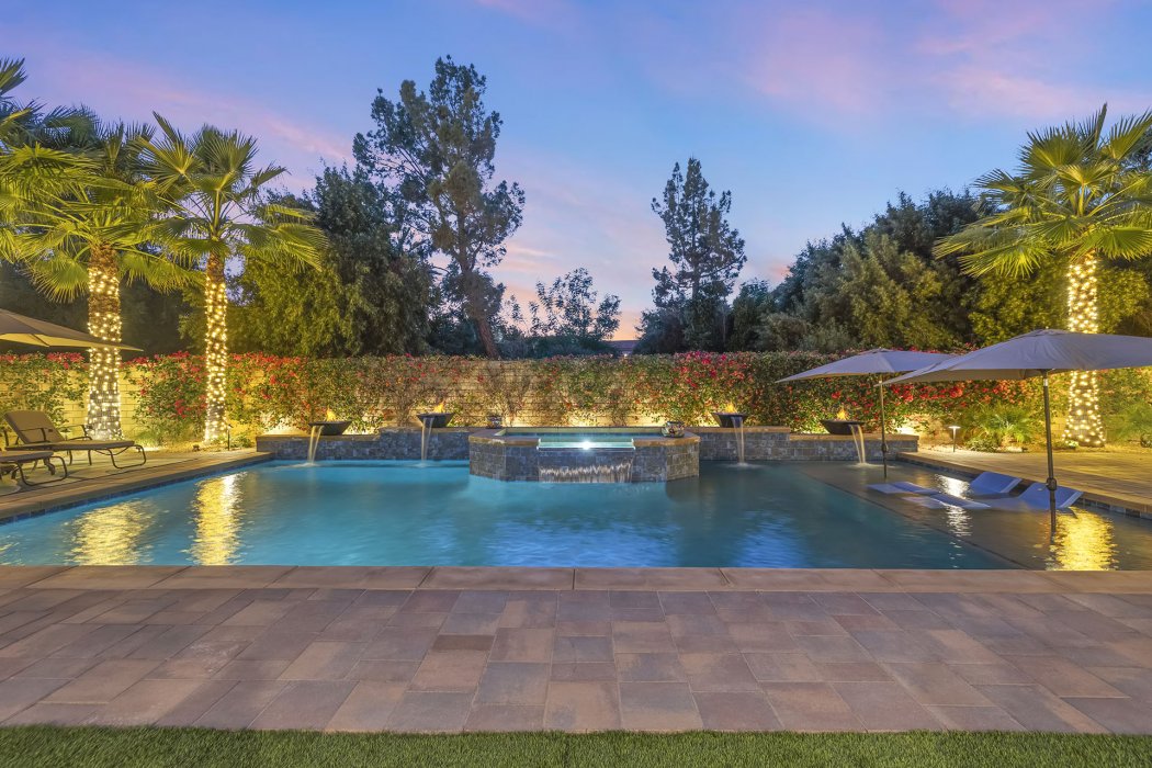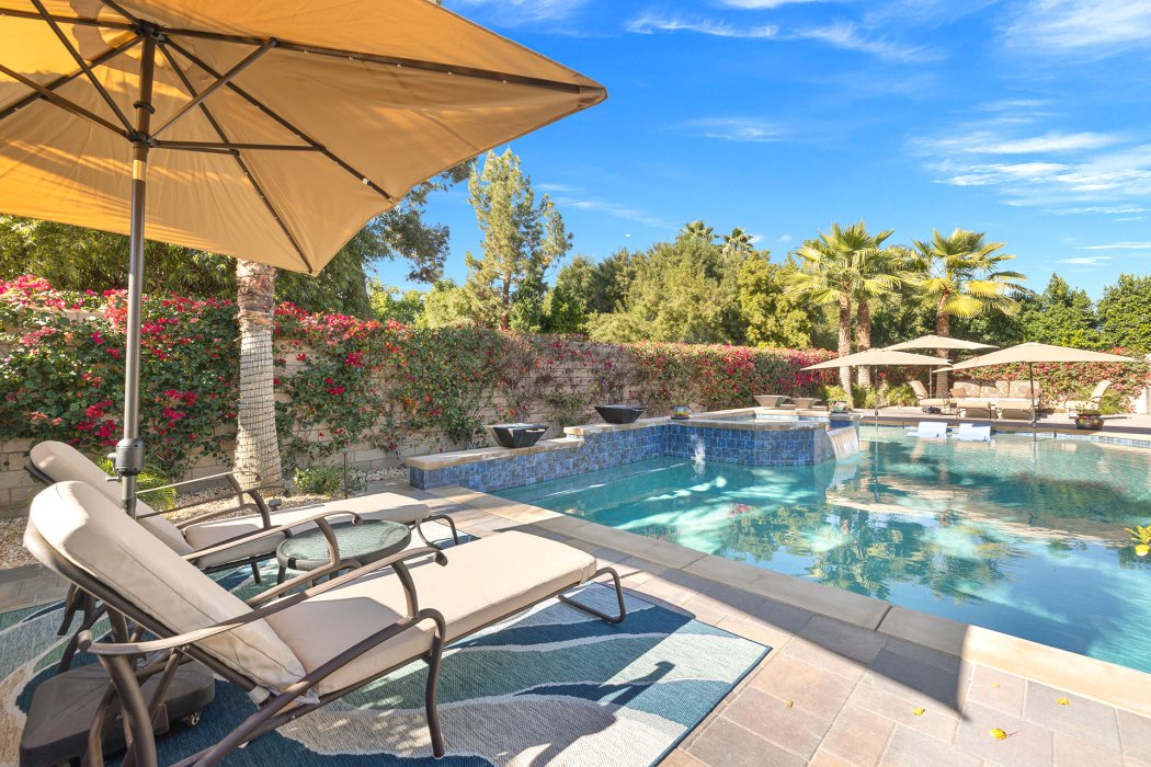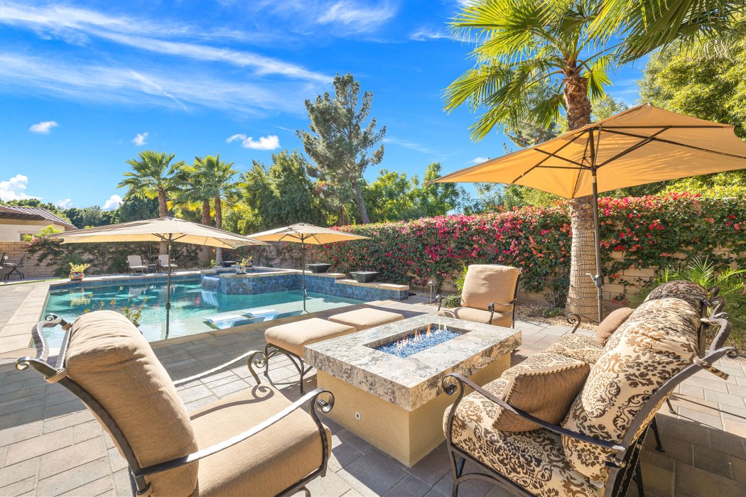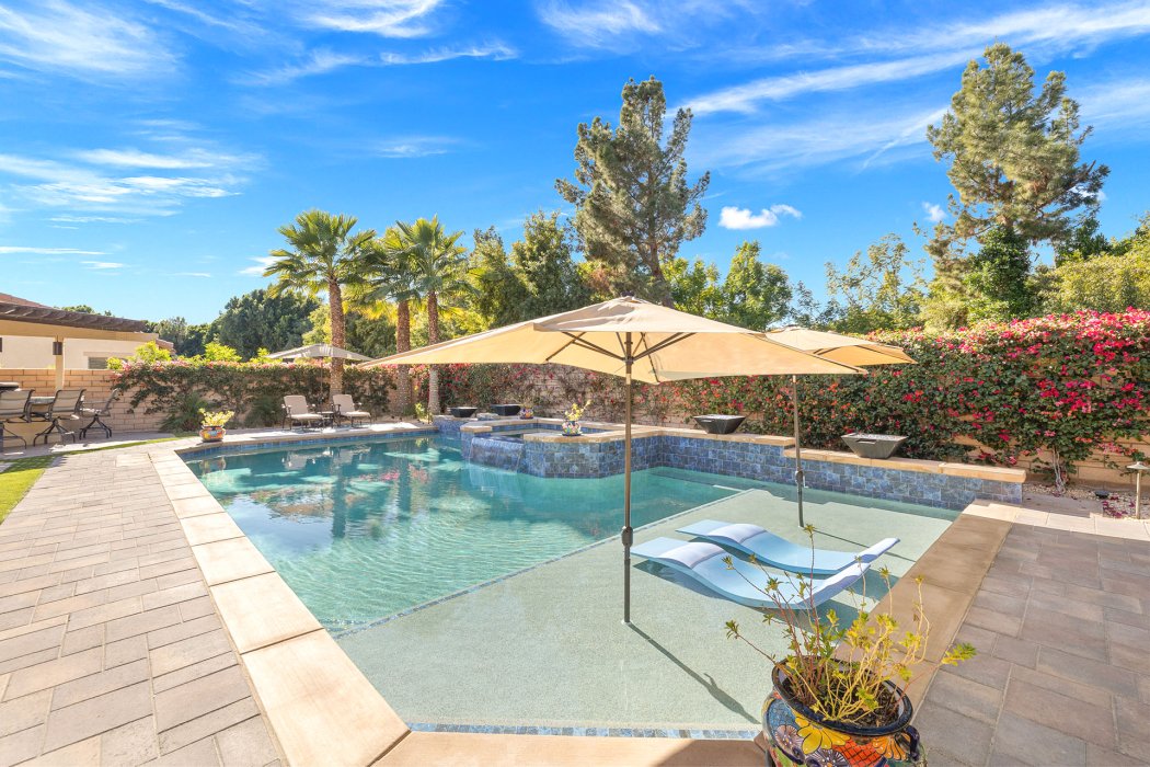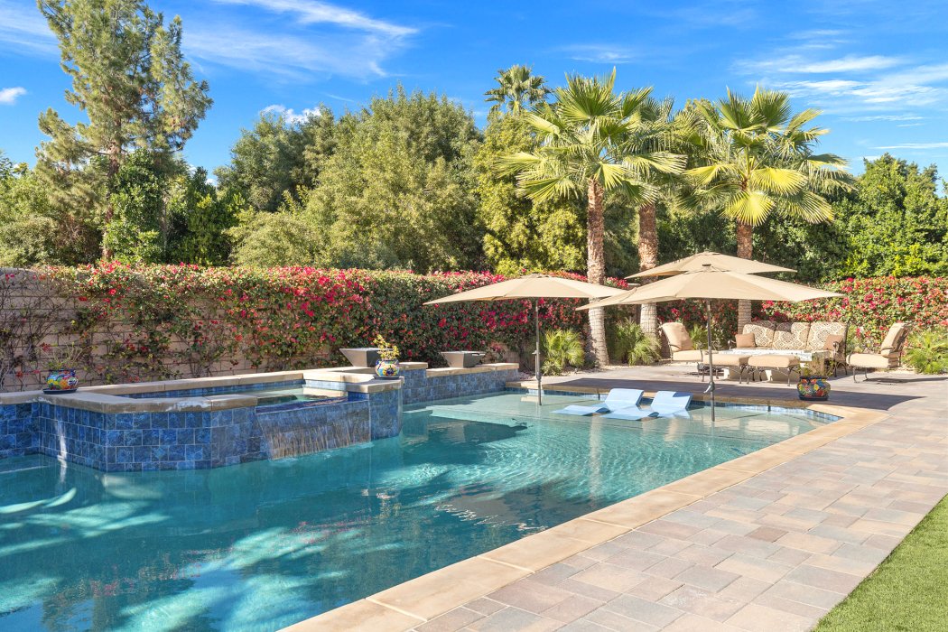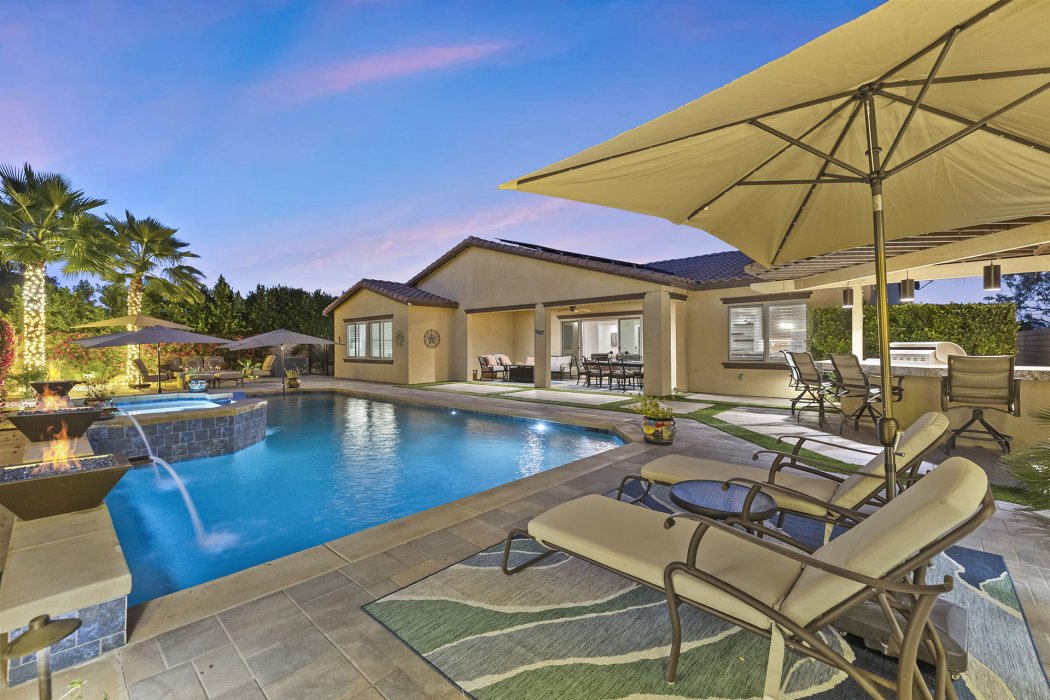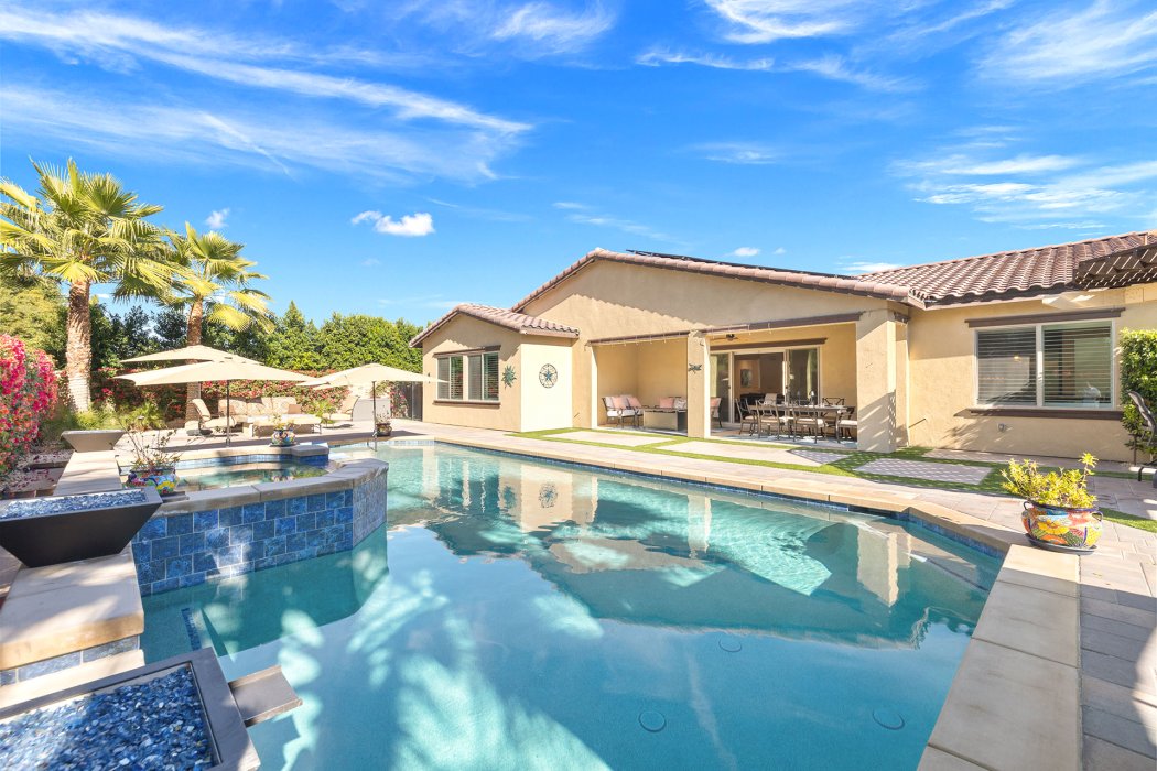 Welcome to Mosaic, a 4 bedroom 3.5 bath desert retreat designed for relaxing in the sun! Outdoors you’ll enjoy a sparkling pool and spa with dramatic fire and water features, BBQ island with seating, multiple firepit lounges, outdoor dining and seating, mature palms with twinkling lights, and sweeping mountain views. Inside, the home features an open concept floorplan with fully equipped kitchen, great room, dining room, media room and comfortable bedrooms. Situated on a generous quarter acre lot, and walking distance to the Coachella Festival grounds, Mosaic offers privacy, elegance, and effortless indoor-outdoor living.