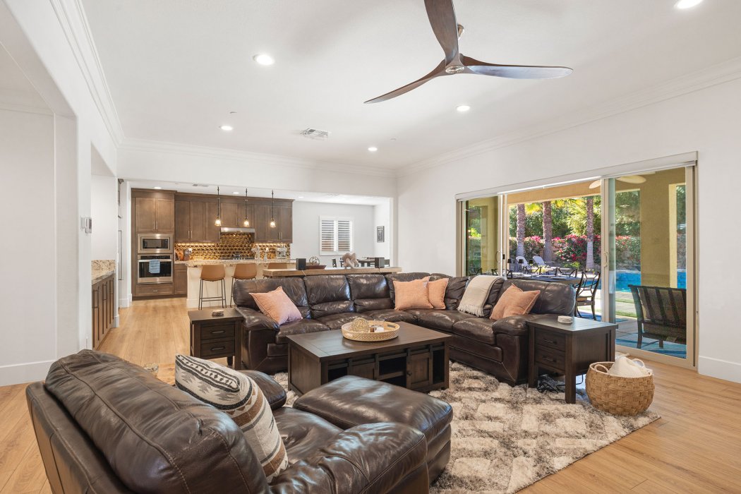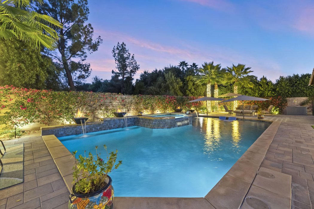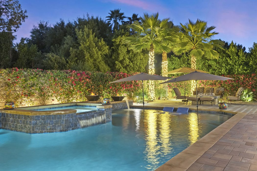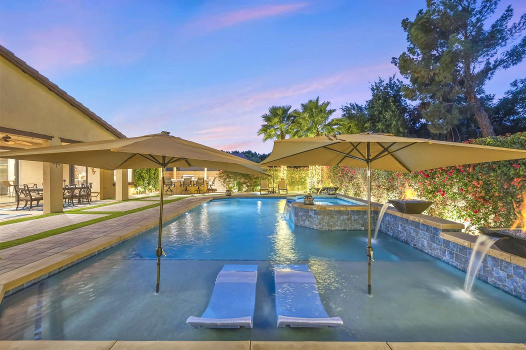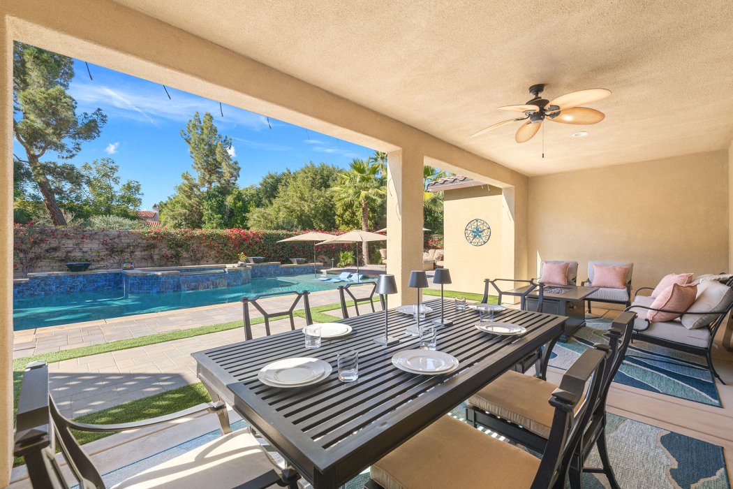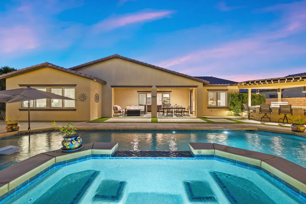 Welcome to Mosaic, a 4 bedroom 3.5 bath desert retreat designed for relaxing in the sun! Outdoors you’ll enjoy a sparkling pool and spa with dramatic fire and water features, BBQ island with seating, multiple firepit lounges, outdoor dining and seating, mature palms with twinkling lights, and sweeping mountain views. Inside, the home features an open concept floorplan with fully equipped kitchen, great room, dining room, media room and comfortable bedrooms. Situated on a generous quarter acre lot, and walking distance to the Coachella Festival grounds, Mosaic offers privacy, elegance, and effortless indoor-outdoor living.