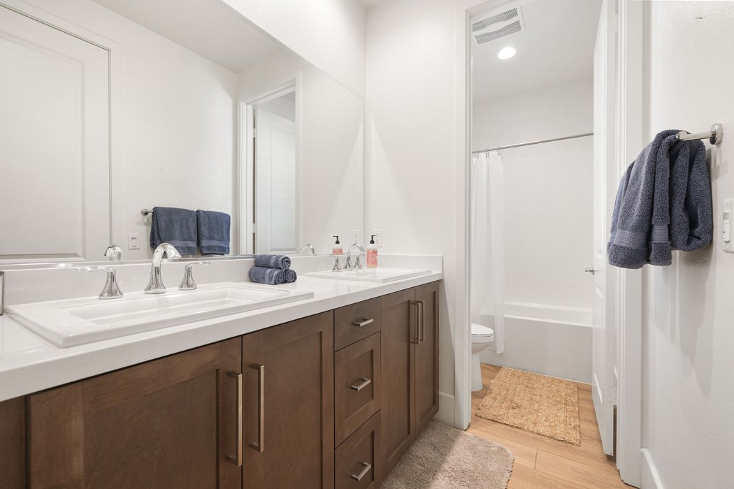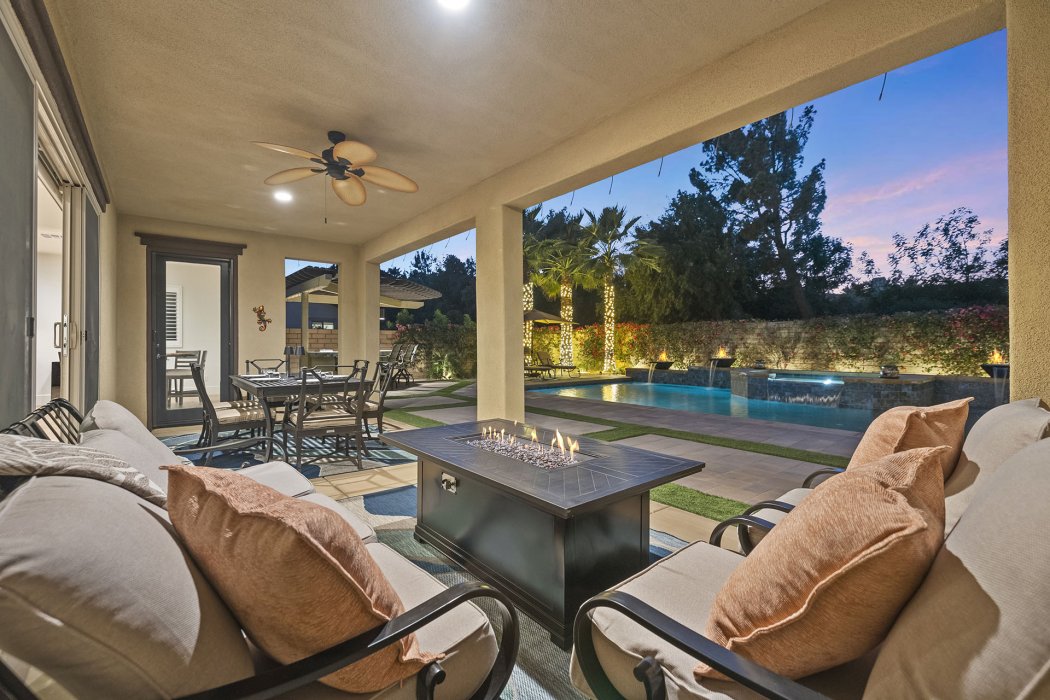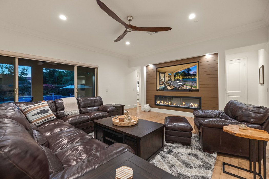 Mosaic’s outdoor living space is a true desert oasis. The centerpiece is a sparkling pool with a tanning shelf and in-pool seating, surrounded by dramatic fire and water features that create inviting day-to-night ambiance. Unwind in the spa, lounge poolside on comfortable chairs, or gather around one of two outdoor firepit seating areas. Enjoy alfresco meals at the outdoor dining table with seating for eight or fire up the built-in BBQ island, complete with bar seating for four. Mature palm trees frame the space, while mountain views provide a stunning natural backdrop for relaxing, entertaining, or soaking up the desert sun.